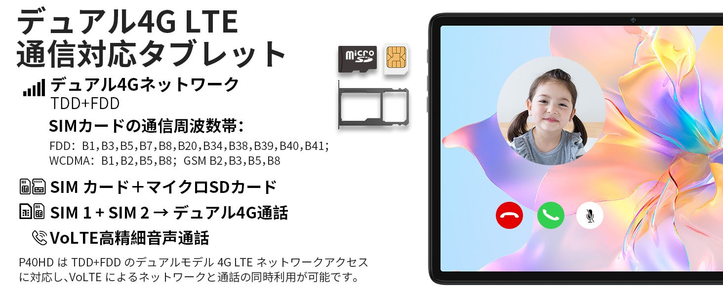 P40HDはTDD+FDDのデュアルモデル4G LTEネットワークアクセスに対応し、VoLTEによるネットワークと通話の同時利用が可能です。デュアルSIMデュアルスタンバイ機能により、仕事とプライベートの切り替えが簡単にできます。802.11ac仕様のデュアルバンドWiFiネットワークに対応し、ネットワークの世界でスッキリ楽しむことができます。Bluetooth 5.0の低消費電力転送により、タブレットの可能性を広げます。