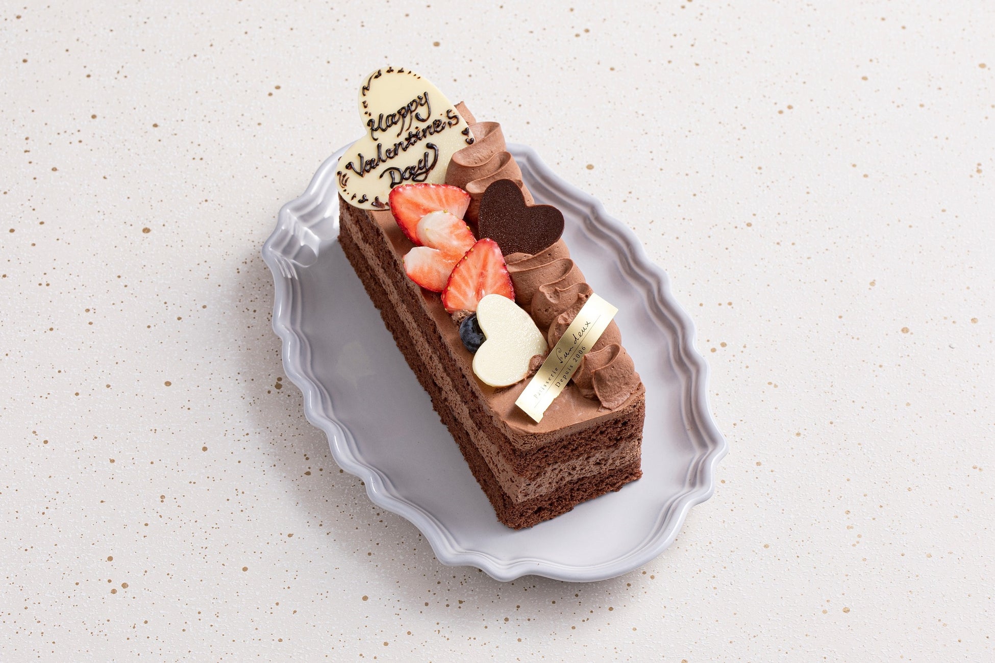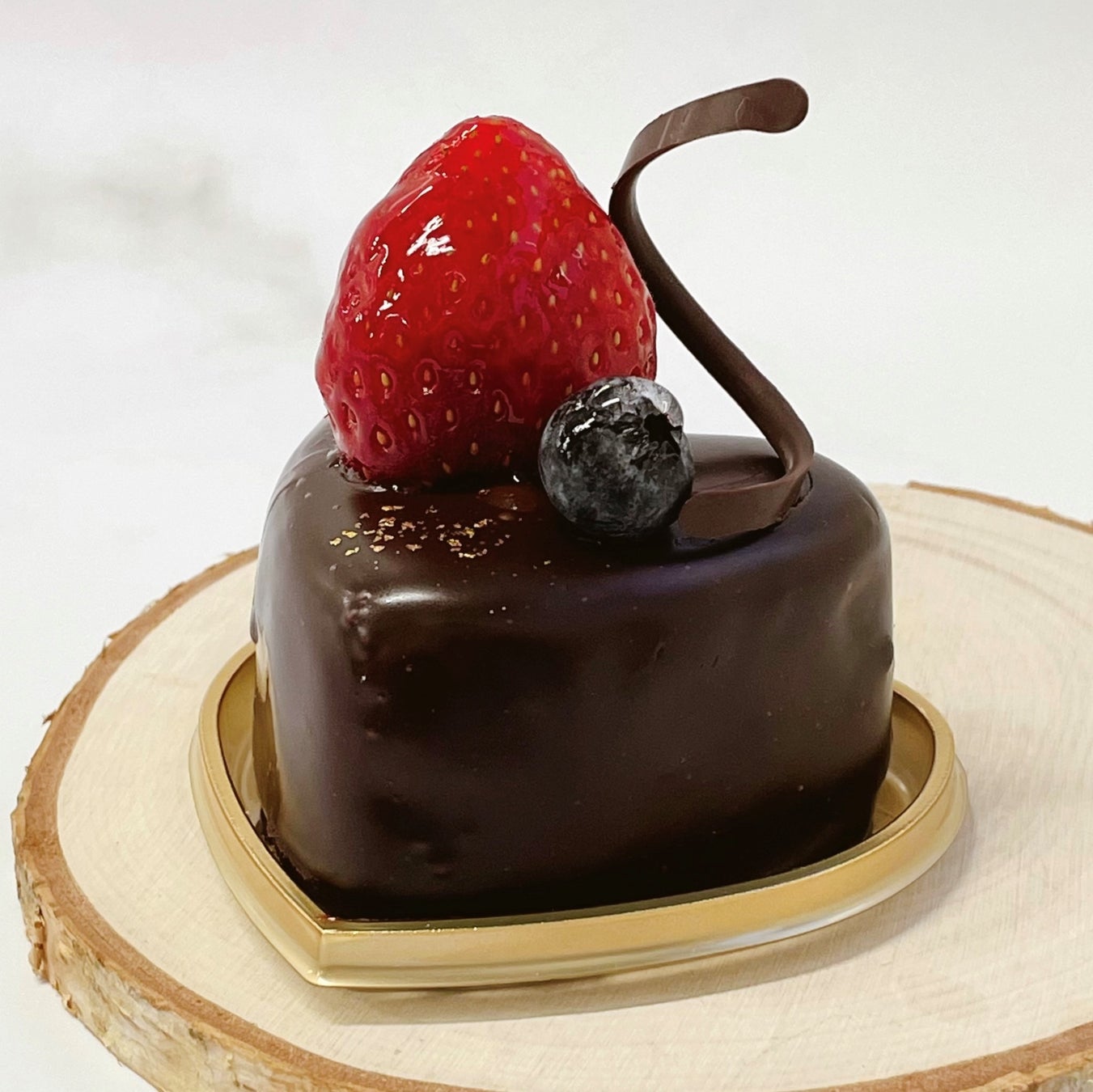 濃厚なコクがとろけだすショコラムースとスポンジに、甘酸っぱいフランボアのムースを重ねて。ルビー色の輝きをまとったハートフルなケーキです。