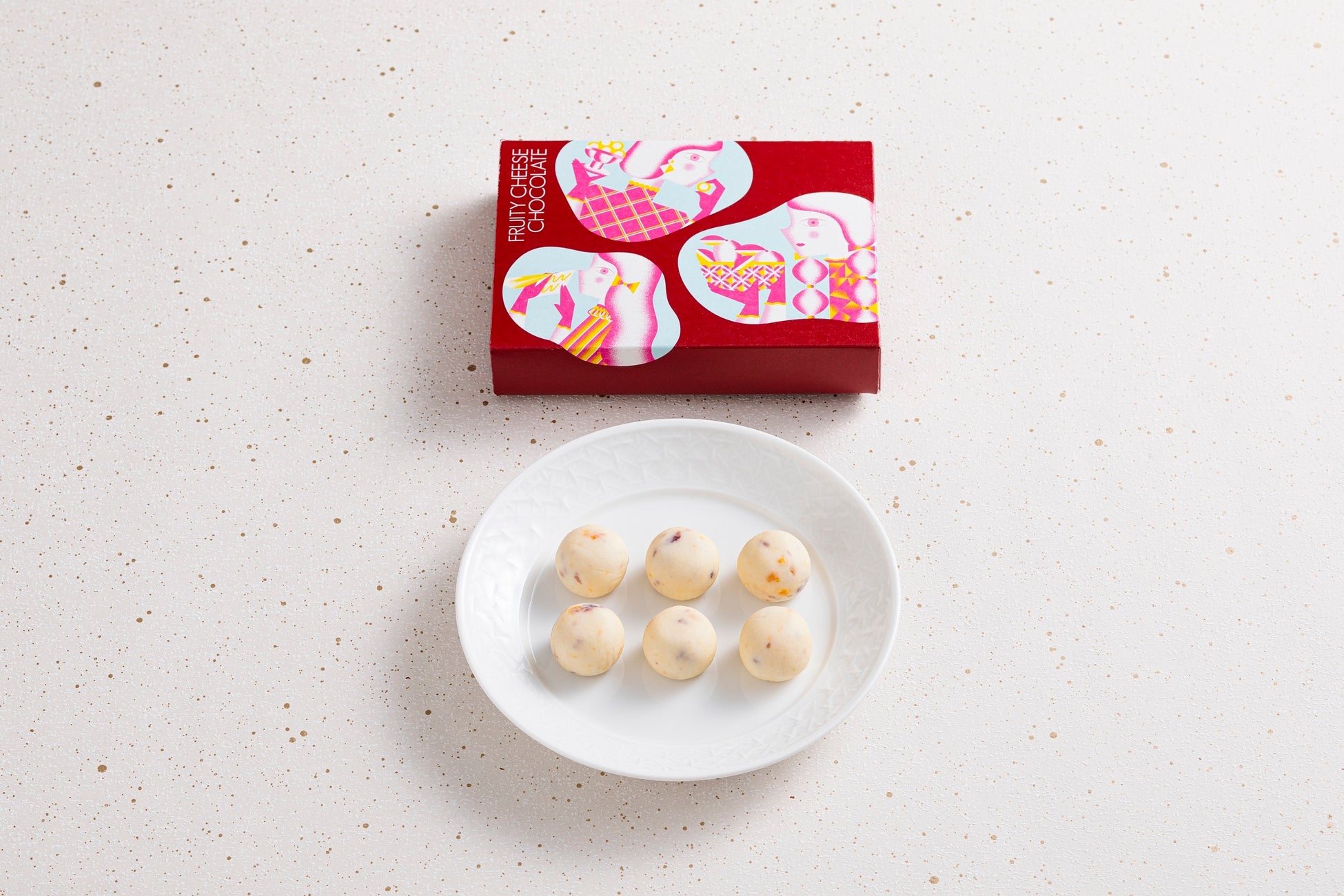 ホワイトチョコレートにチェダーチーズをブレンドしたほんのり塩味のあるなめらかなチョコレート。中からは、赤いクランベリーと黄色のマンゴーで華やかさと味わいの変化を楽しめるチーズスイーツ専門店のチョコレート。※新商品
