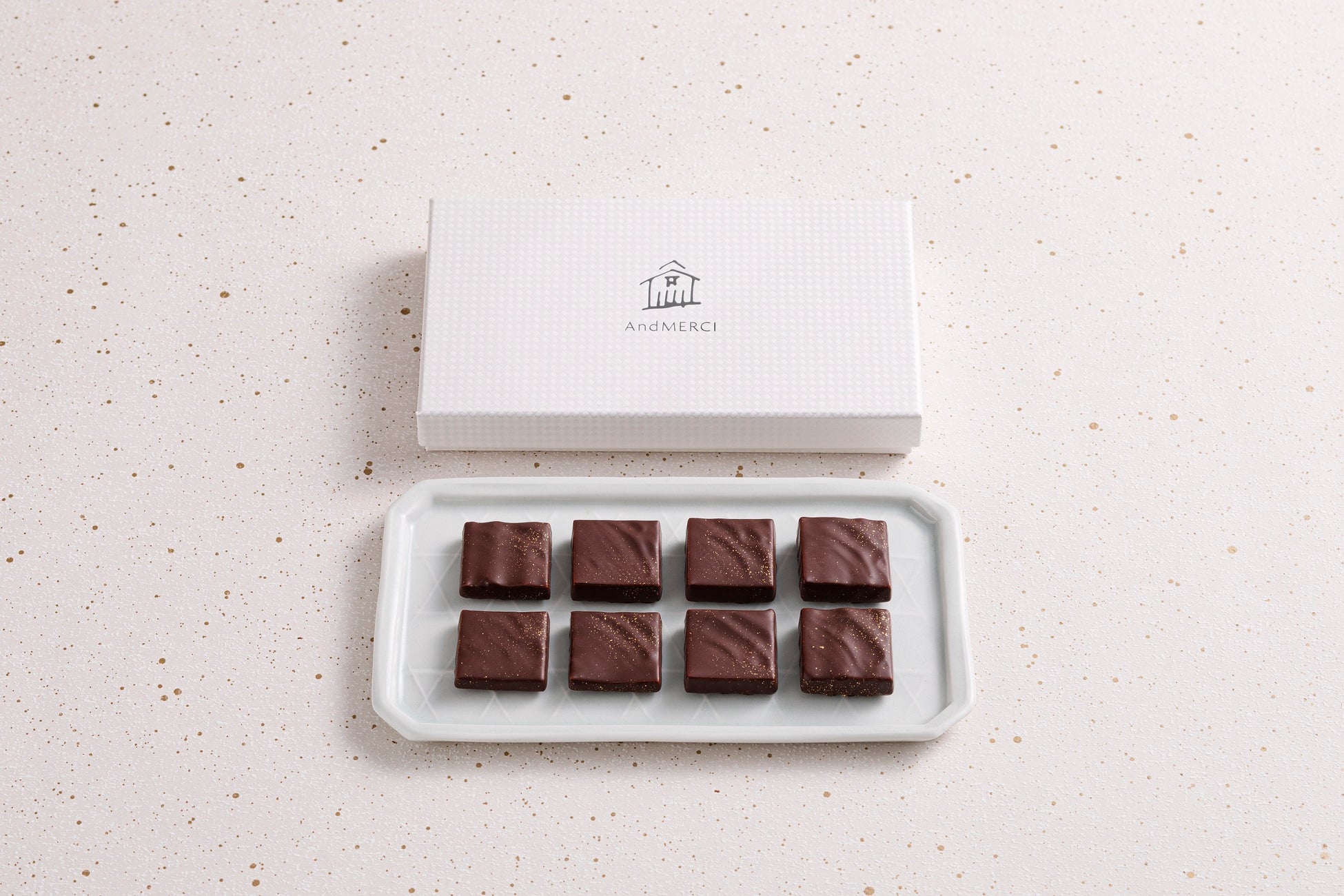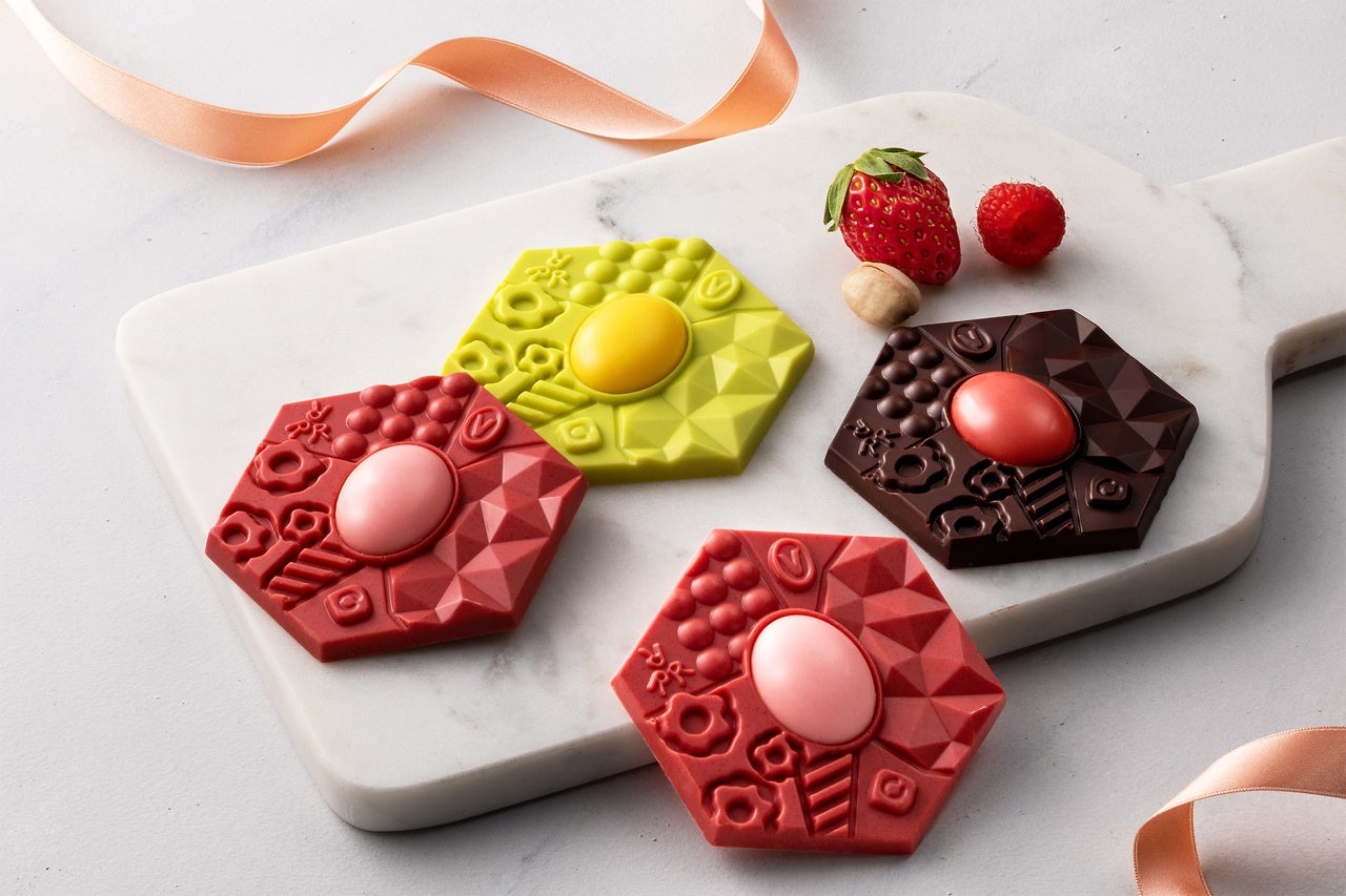 コンフィチュール⼊りの宝⽯ショコラをあしらった、華やかな香りあふれるオリジナルのタブレットショコラ。