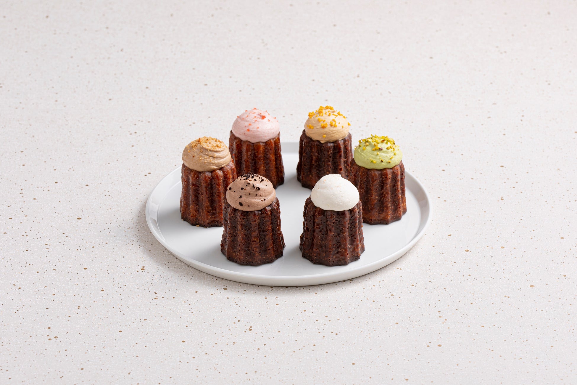 外はカリッと、中はもっちり。噛むたびにラム酒とバニラの味わいが口いっぱいに広がるカヌレに6種類のクリームを合わせました。