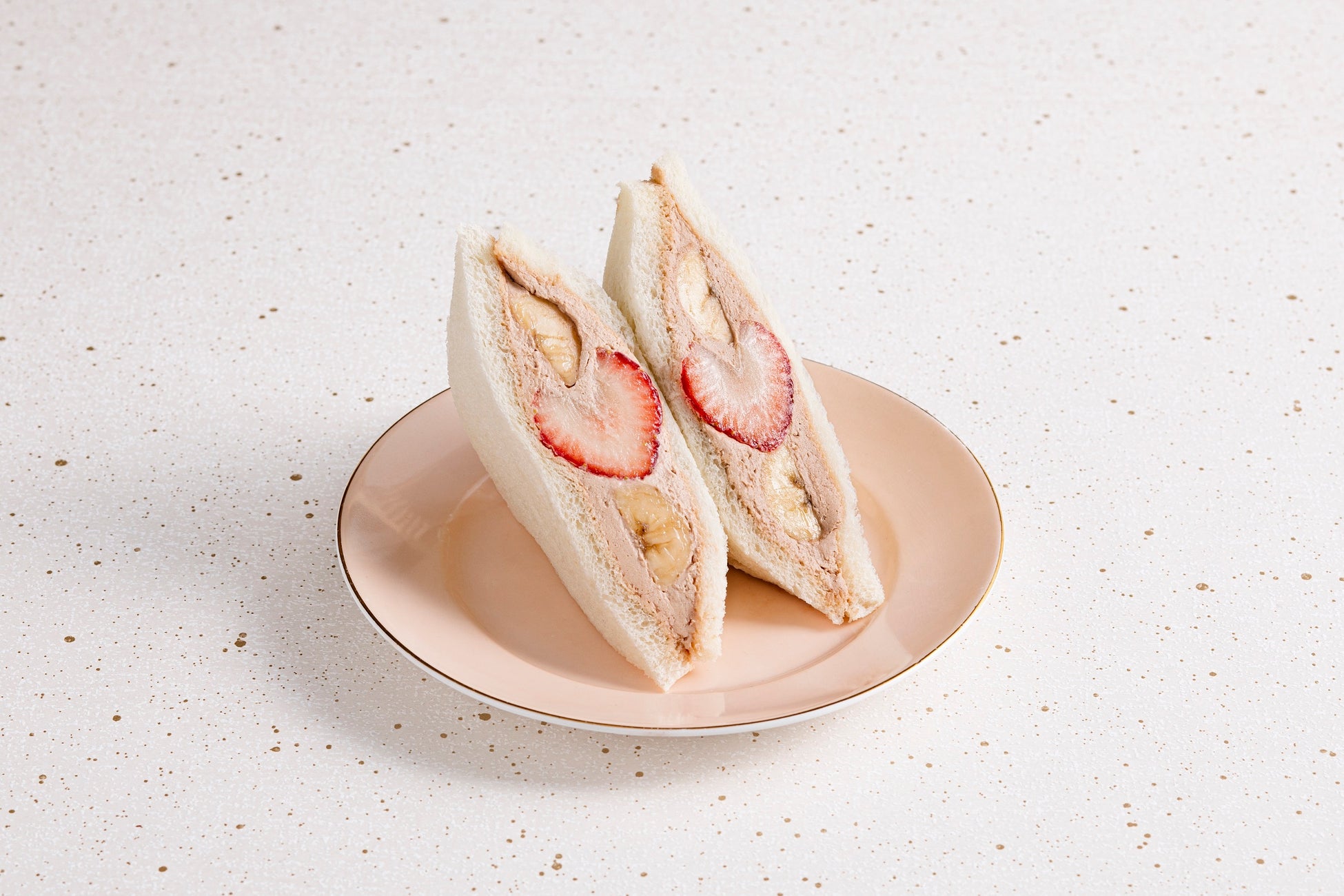チョコクリームでバナナとハート型の苺をサンドしたかわいいサンドイッチです。