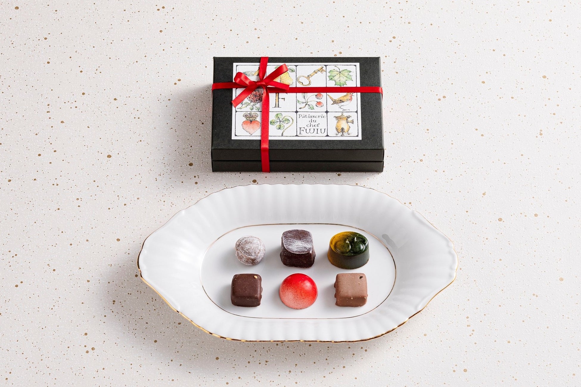 フジウこだわりのチョコレート6粒入り。フルーツや紅茶などのガナッシュが香ります。