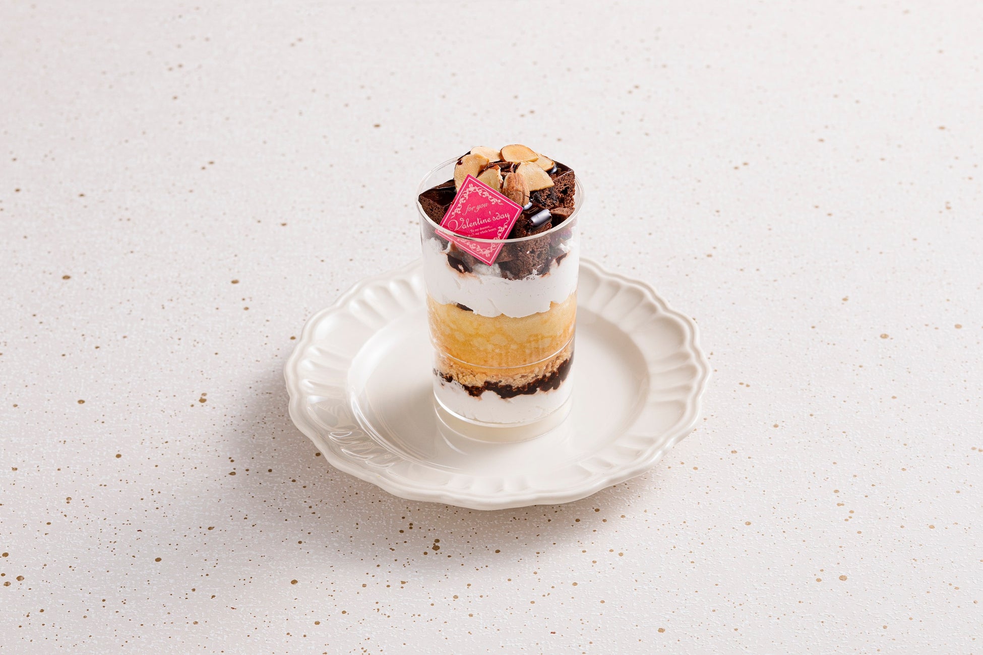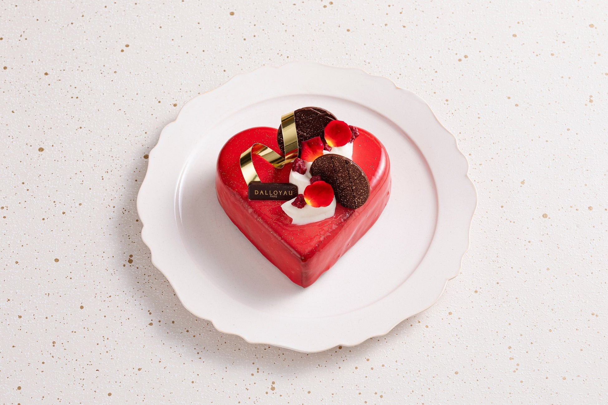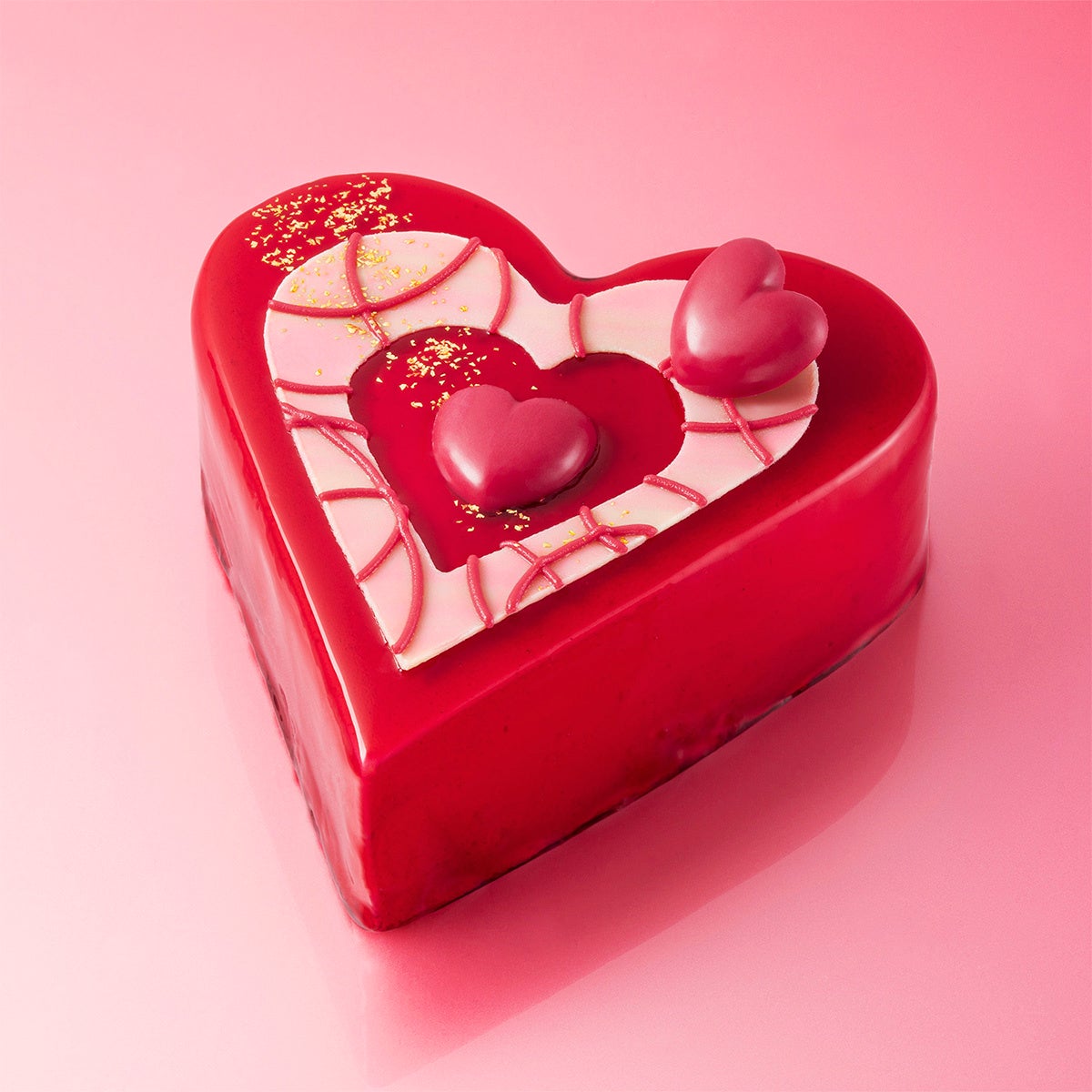 赤いグラサージュが艶やかなハートのアントルメ。ムースショコラにクレームフランボワーズを閉じ込めた濃厚な味わいをお楽しみいただけます。※販売期間:上野・大宮 1/27~2/14、立川 2/10~14