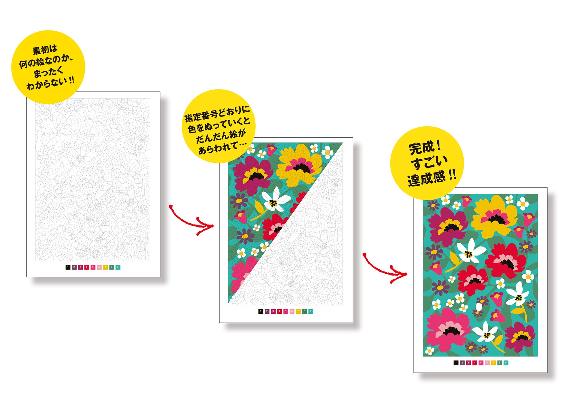 すきまなく並んだピースのどこに花が隠れているのでしょうか? 塗る前のピースを眺めてもまったくわかりません。夢中で塗り進めていくうちに、可愛らしい花々が浮かび上がってきます!