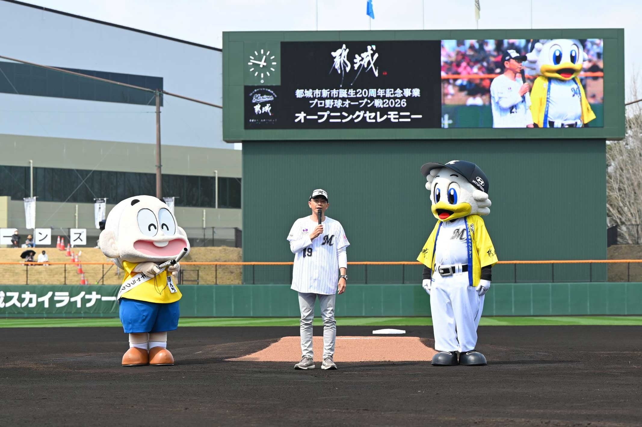 2月28日㈯、新市誕生20周年を記念して都城コアラのマーチスタジアムでプロ野球オープン戦を開催。オープニングセレモニーでは、池田市長のあいさつや園児によるダンス、都城市民吹奏楽団による演奏などが行われました。