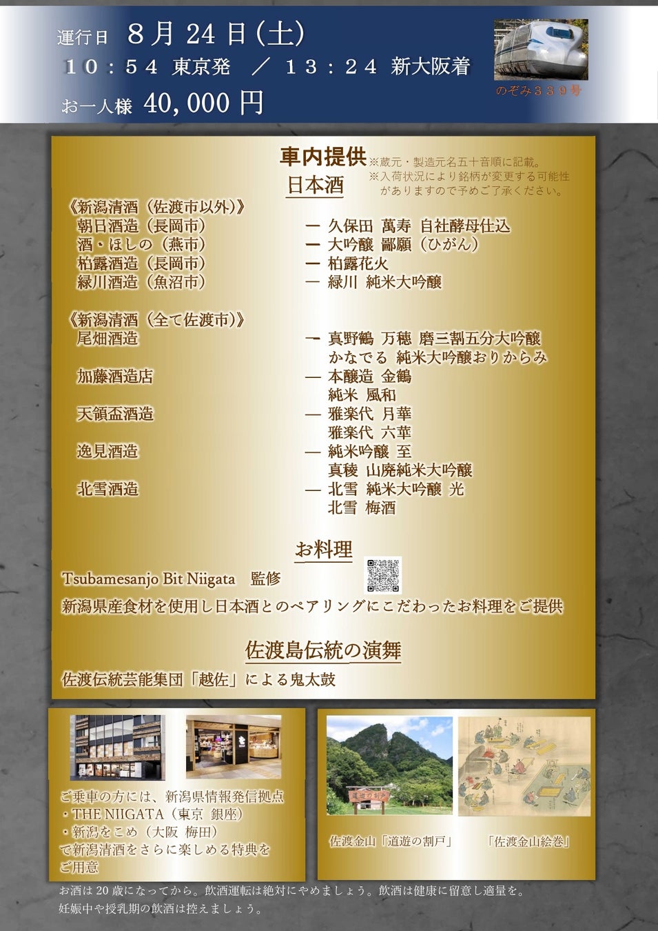 新潟県日本酒振興室では、2024年8月24日(土)、新潟のプレミアムな日本酒と厳選された食材による料理を堪能できるイベントを、東海道新幹線「のぞみ」の貸切車両で行います!