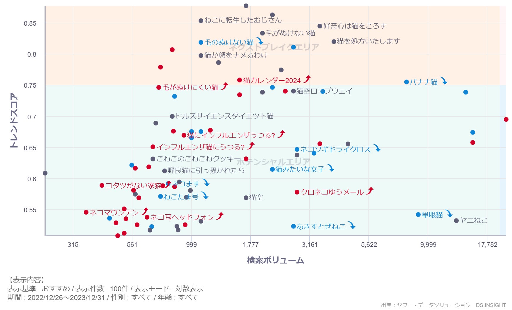 ヤフー・データソリューションでは、Yahoo! JAPANの検索や位置情報ビッグデータをブラウザー上で調査・分析できるデスクリサーチツール「DS.INSIGHT」を提供しています。この中の急上昇トピックやトレンドを可視化分析できる「DS .INSIGHT Trend」機能を使用し、検索数の伸びから今後トレンドになりそうな「猫」「ねこ」「ネコ」を含むワードを分析しました。