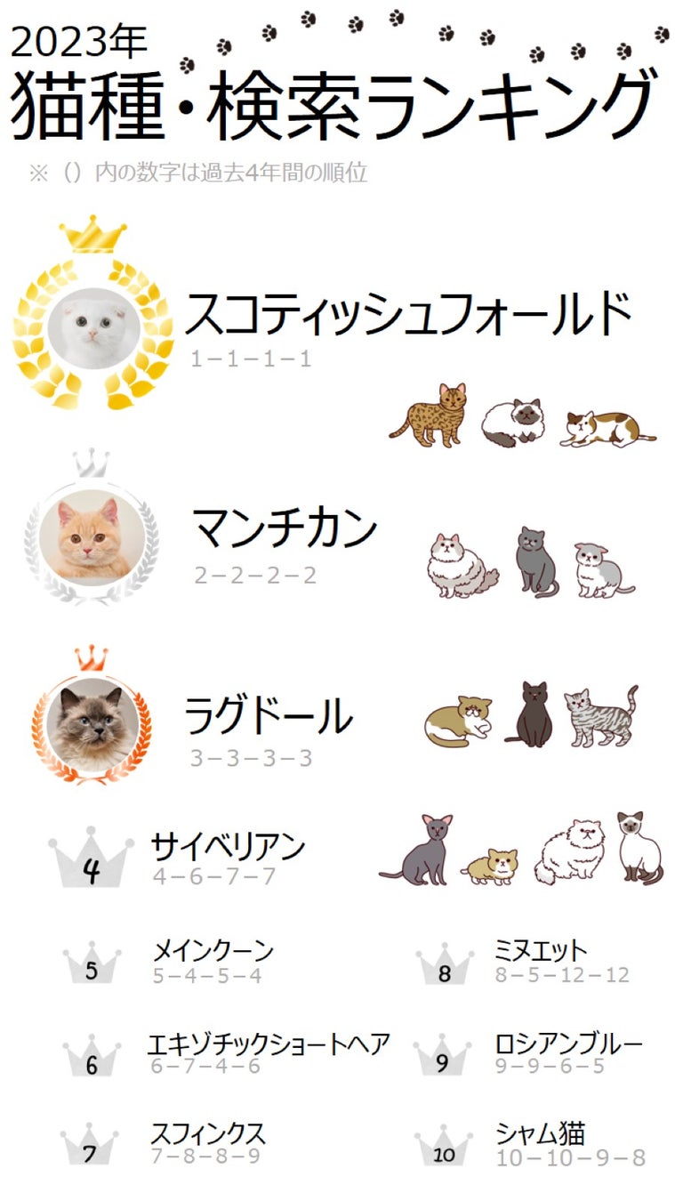 また、短い足が特徴の「マンチカン」、長毛種の「ラグドール」も検索では人気が高く、両種が2位と3位を4年間保ち続けていました。検索においては「スコティッシュフォールド」、「マンチカン」、「ラグドール」が“人気猫の3強”と言えそうです。