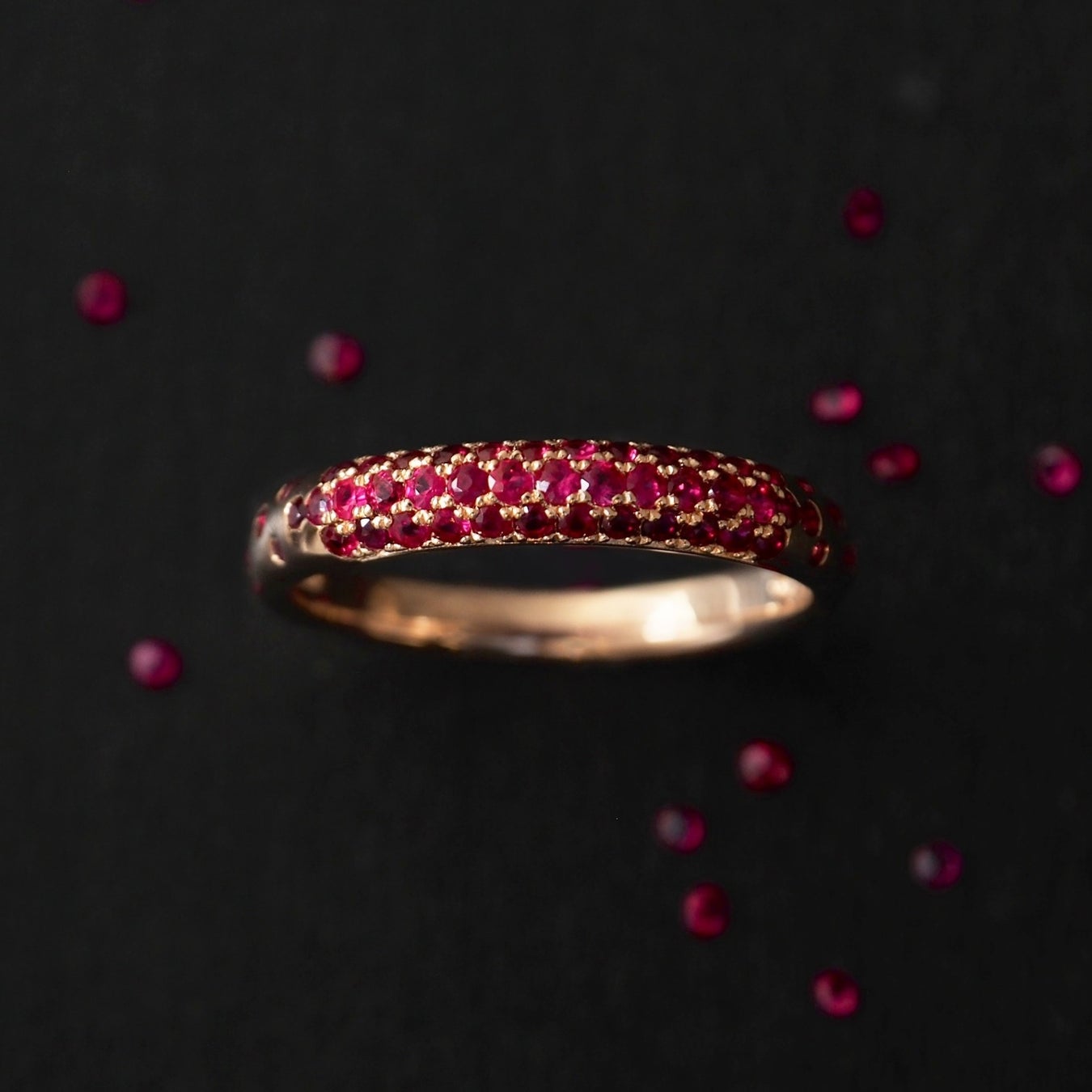 ルビーには、肌になじみやすいK10ピンクゴールドを合わせ、やわらかな艶を引き出しております。ブルーサファイアは、K10イエローゴールドとホワイトゴールドの2種類をご用意し、合わせる地金によって青の見え方にわずかな違いが生まれ、表情に奥行きをもたらします。
