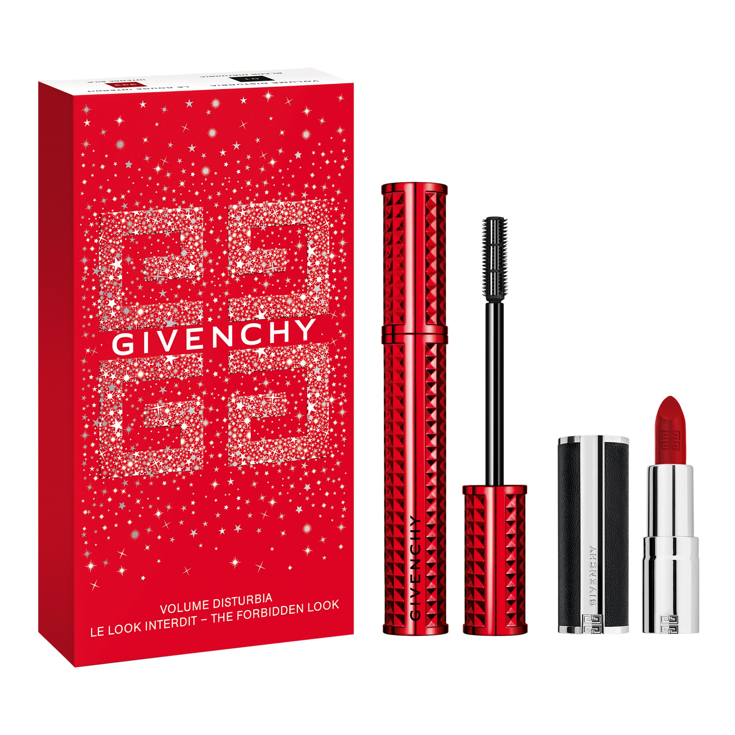 圧倒的なボリュームとインテンスな発色でまつ毛を美しく整えるマスカラ「ボリューム・ディスタービア」の現品と、高発色で光沢をおびたシルキーな仕上がりの「ルージュ・アンテルディ・シルキー」のミニサイズがセットになった限定キット。赤いボックスの表面にはロゴが施され、ギフトにふさわしいデザインです。