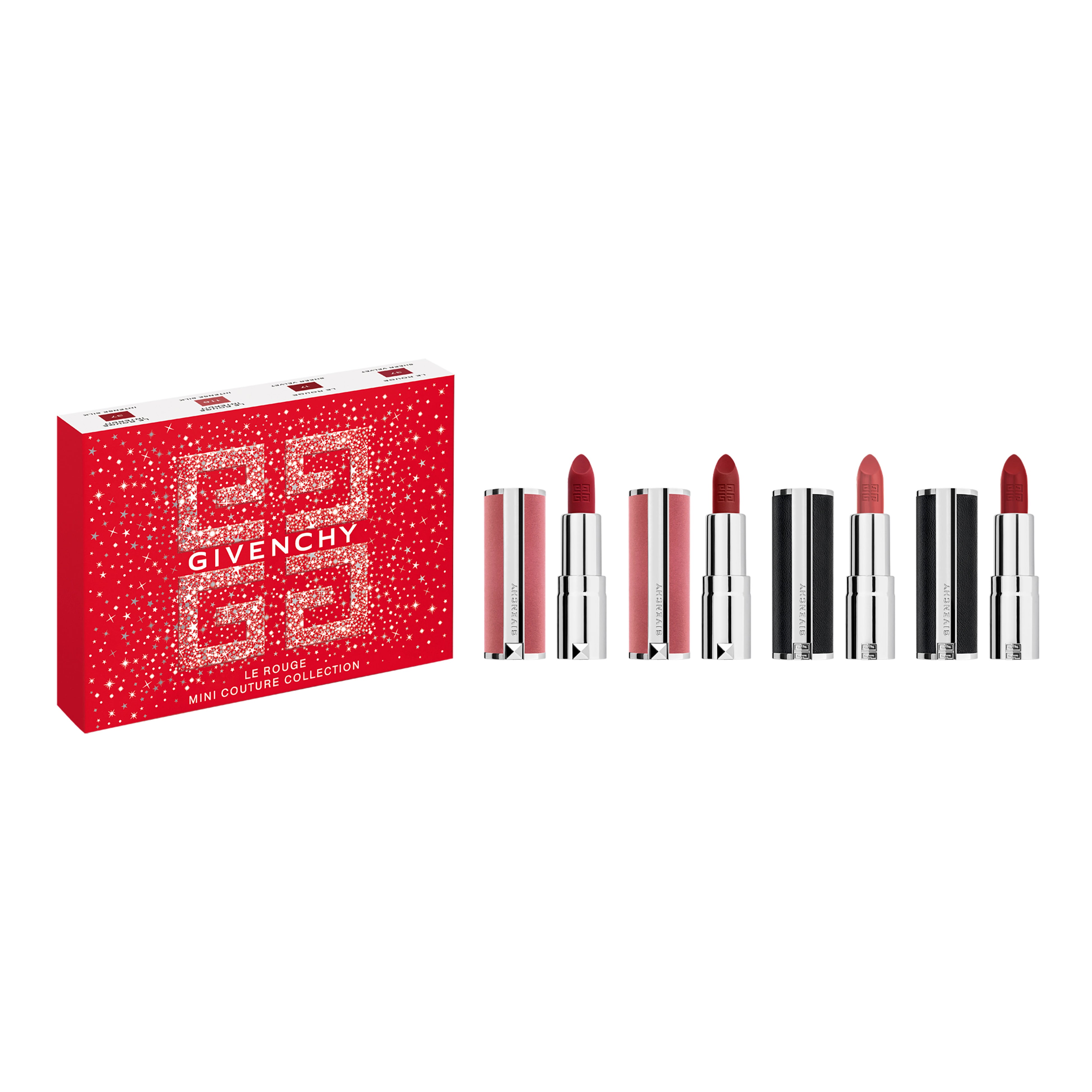 高発色で光沢をおびたシルキーな仕上がりの「ルージュ・アンテルディ・シルキー」と、ナチュラルマットの仕上がりの「ルージュ・ジバンシイ・シアー・ベルベット」。人気シェードのミニサイズが4本セットになった限定キット。ポケットに入れてもかさばらないミニサイズのリップは、持ち運びにも便利。赤いボックスの表面にはロゴが施され、ギフトにもふさわしいデザインです。