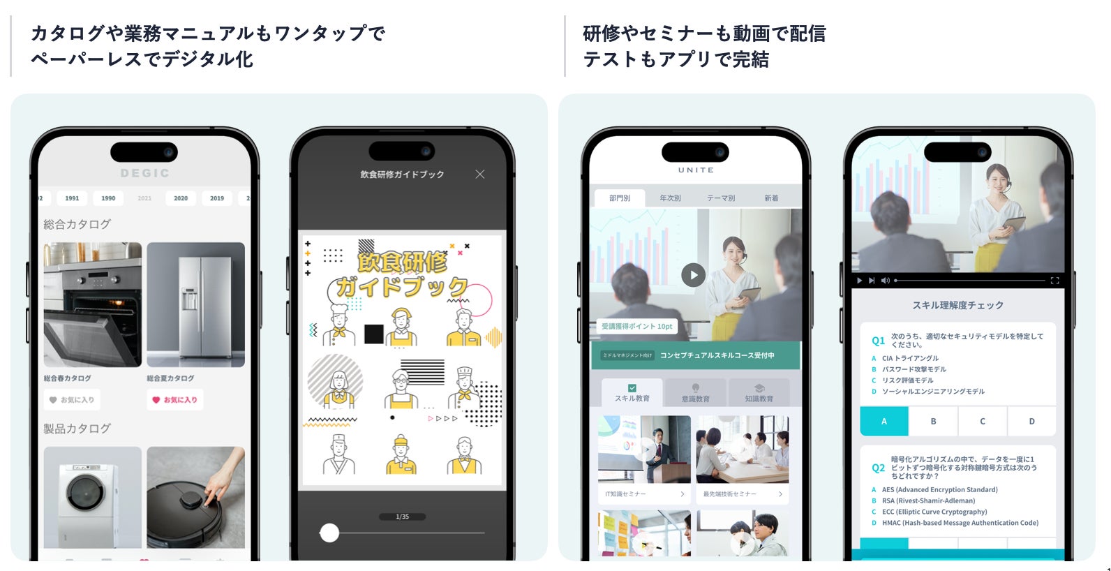 ・学べる(人材育成):カタログや業務マニュアルをペーパーレスにデジタル化し、研修やセミナーも動画で配信。研修後のテストもアプリで完結できるコンテンツを提供することで、従業員が「いつでもどこでも」能動的に学べる環境を整備し、個人の成長と組織全体のスキルアップを加速させます。