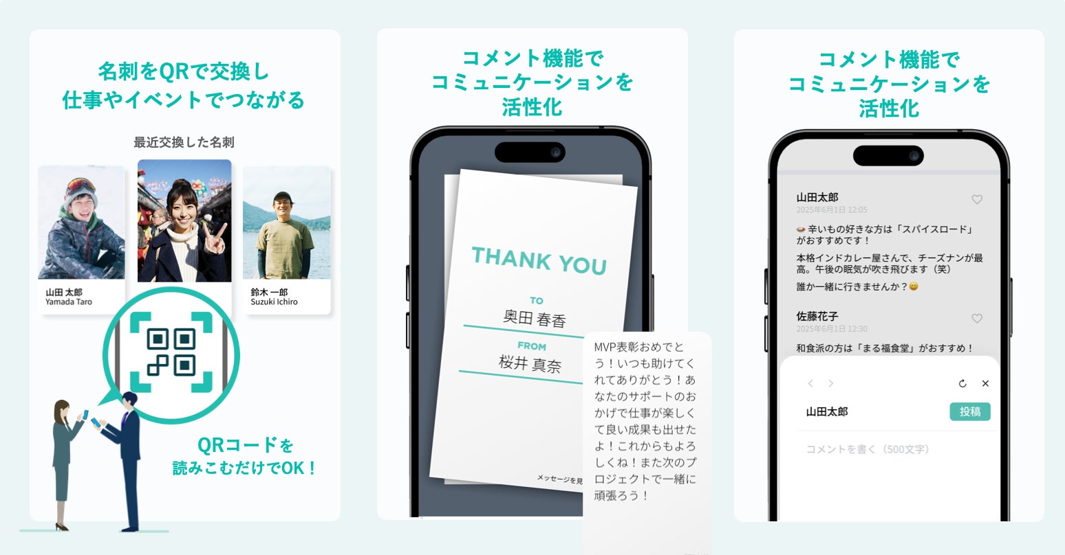 ・つながる(社内交流):UNITEでは対面での繋がりを重視して、社内で横の繋がりを広げて業務効率を高めるコミュニケーションを促進します。対面での出会いをアプリとつなげることで、昨今の多様化する働き方の影響もあり難しくなっている部署を超えた深い人間関係の構築や、共通の興味・関心を通じた社員同士の交流を促進します。また、サンクスカードや掲示板(コメント機能)を通じて、感謝と共感があふれる組織をアプリで広げ、偶発的な情報交換や新たな協業の機会を生み出し、組織全体のイノベーションとエンゲージメントを高めることが期待されます。