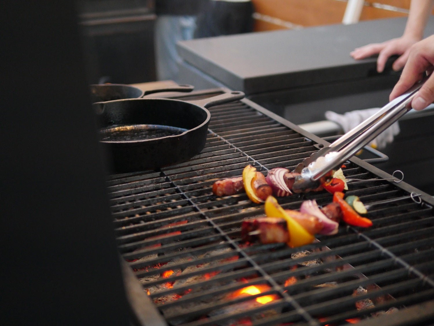 北海道産の余市ワインポークソーセージ、黒松内町「トワヴェール」のスモーク生ベーコン、パプリカ・ズッキーニとともに串に差し炭火で焼きあげます。(税込800円)