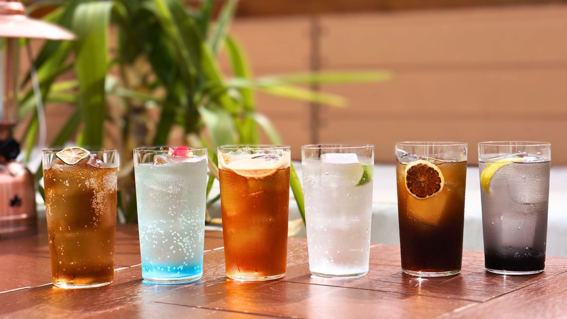 (左から:ハニージンジャーモスコミュール・ナイヤガラワインボール・アールグレイハイボール・白桃ジントニック・バターラムコーク・チャコールリモンチェッロ)