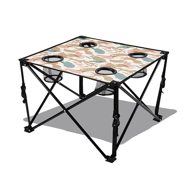 収納・組立が簡単なコンパクトテーブル。コーナーにドリンクホルダーが4つ用意されており、サブテーブルとしても重宝します。天板の四方から出ているベルトを引っ張るとテンションが調整できます。