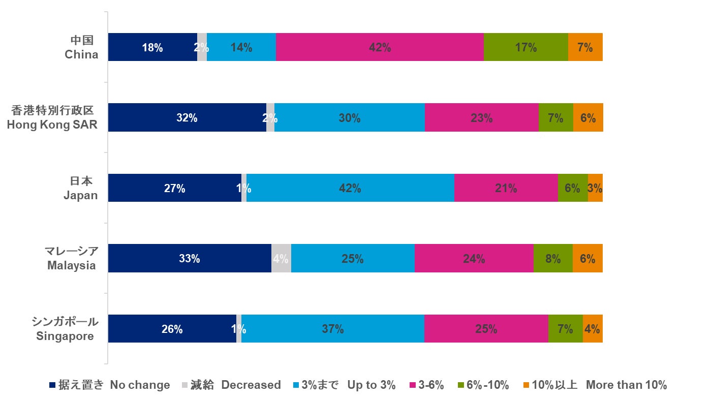 また、社会人9598人への調査の結果、昨年の昇給率について、日本は3%以下の昇給が7割だったのに対し、中国では34%、香港では64%、マレーシアは62%、シンガポールは64%でした。