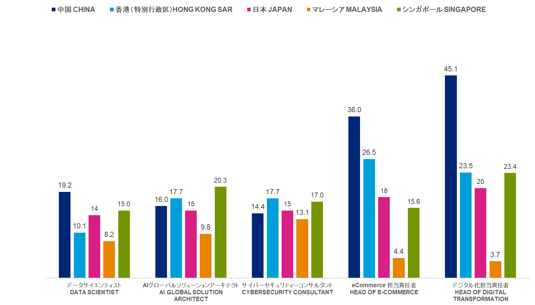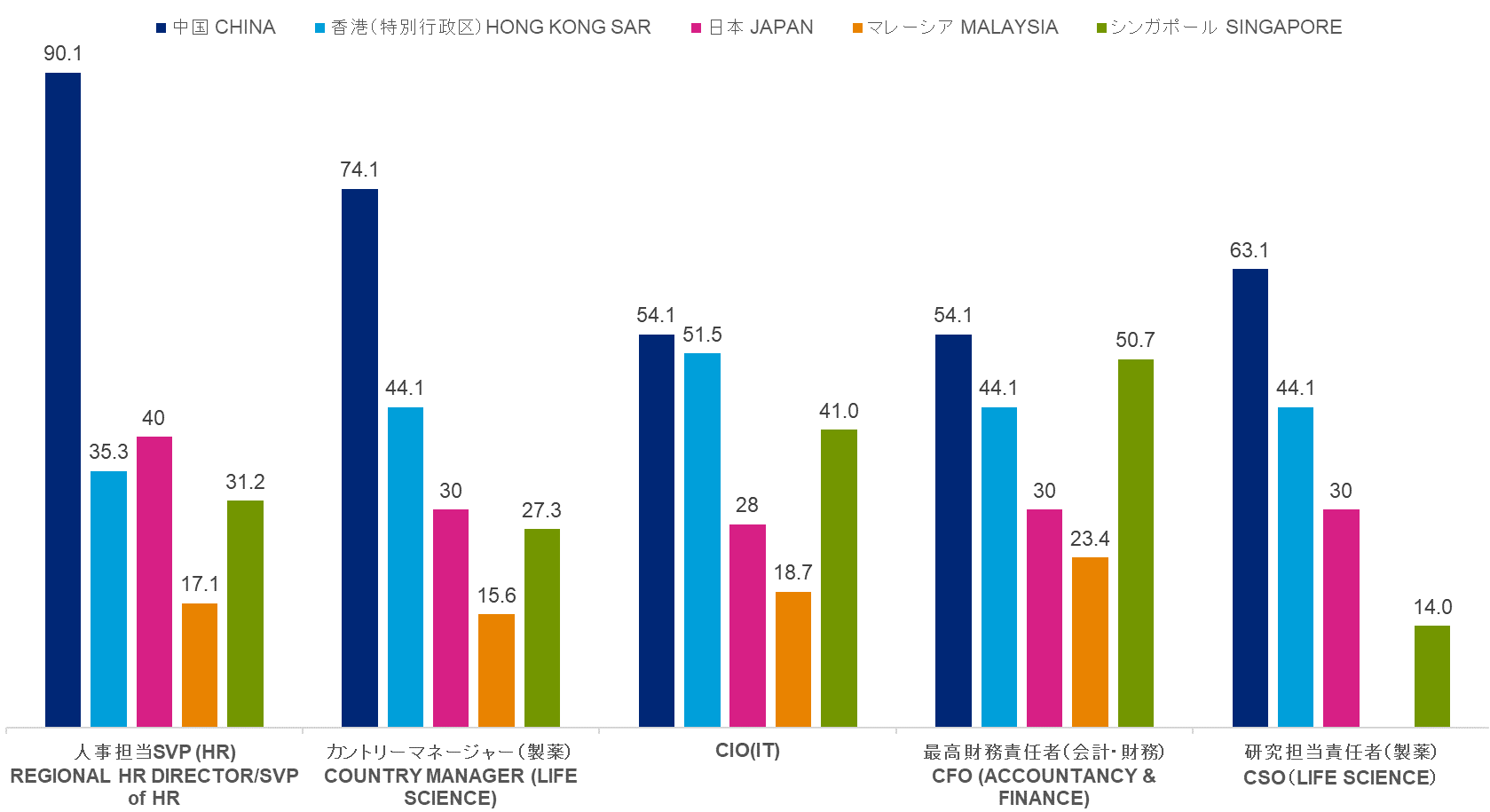 - トップIT人材やエグゼクティブクラスなど、一部のハイスキル人材の職務の給与においては中国、香港特別行政区、シンガポールで日本を上回る(当社実績ベース)