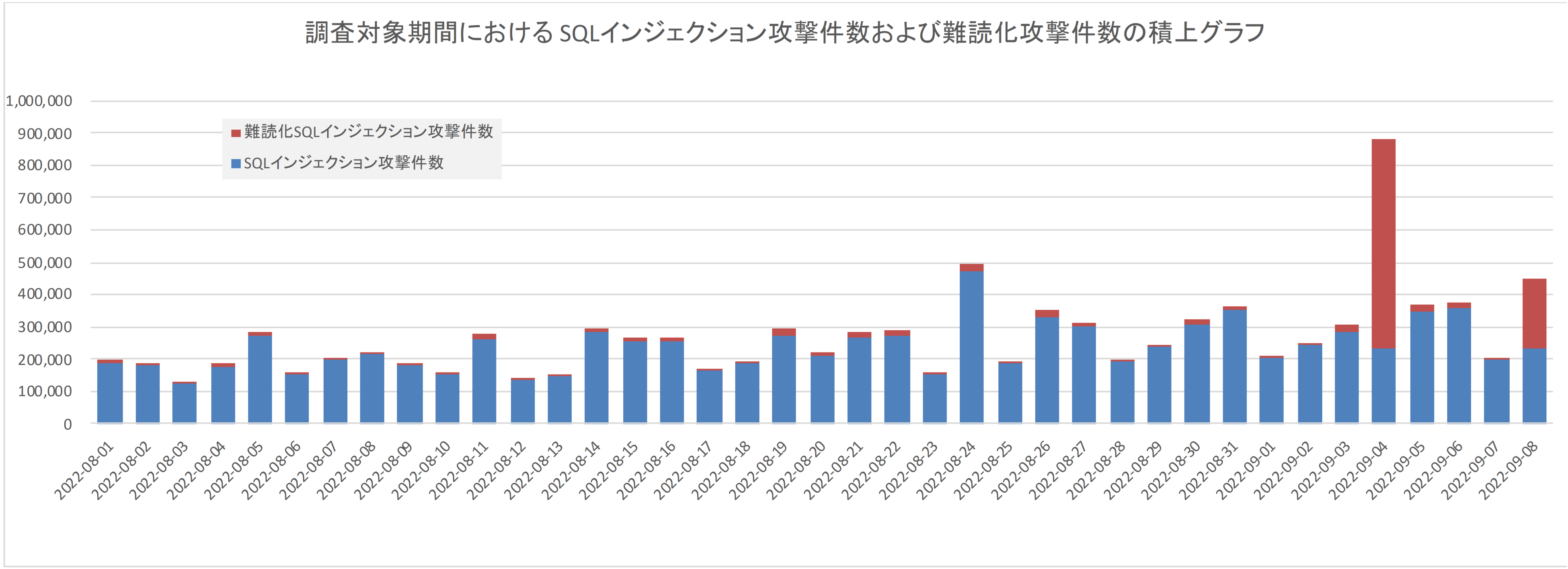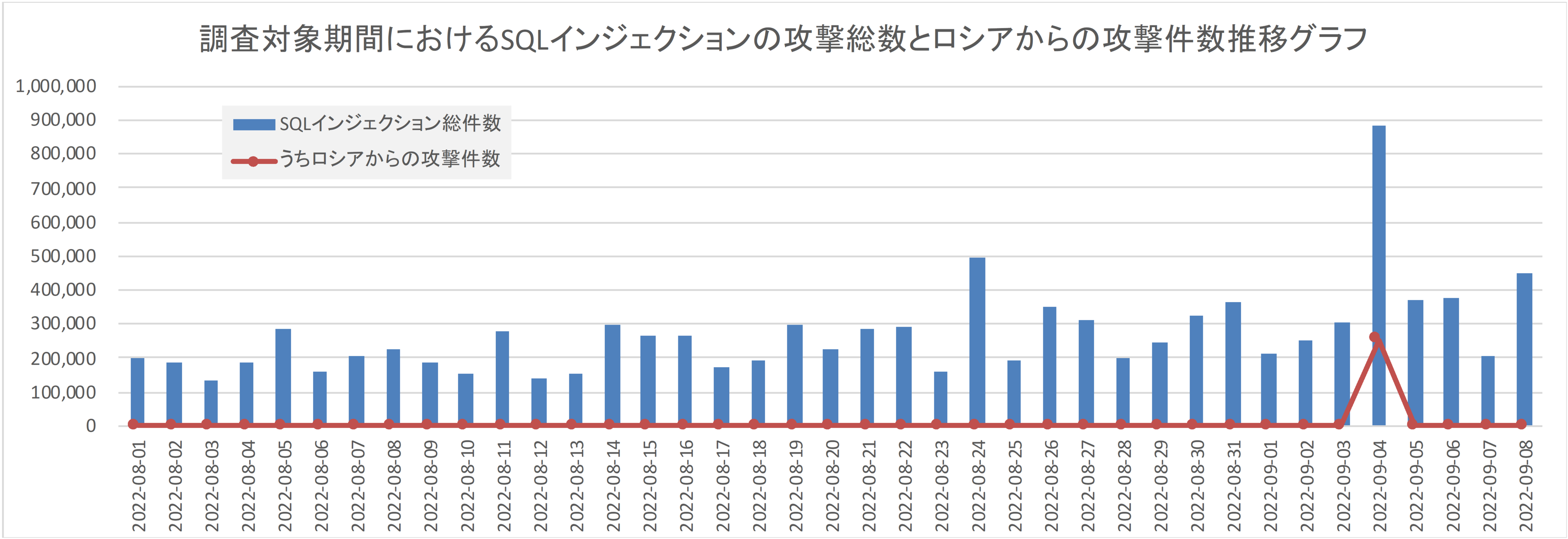 また本件との関連性は不明ですが、当社の検知ログ上で9月4日にSQLインジェクション攻撃が急激に増加していることが当社の調査で明らかになりました。