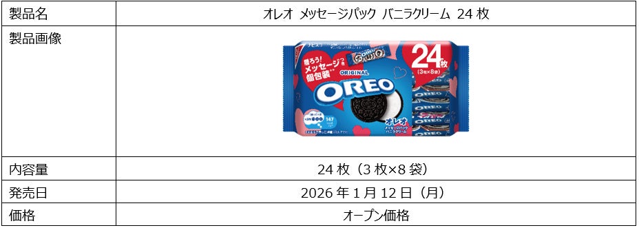 モンデリーズ・ジャパン株式会社(本社:東京都品川区/代表取締役社長:碇祐輔)のビスケットブランド「オレオ」は、バレンタインに向けて、3文字メッセージつき個包装が入った「オレオ メッセージパック バニラクリーム 24枚」を2026年1月12日(月)より全国で発売します。