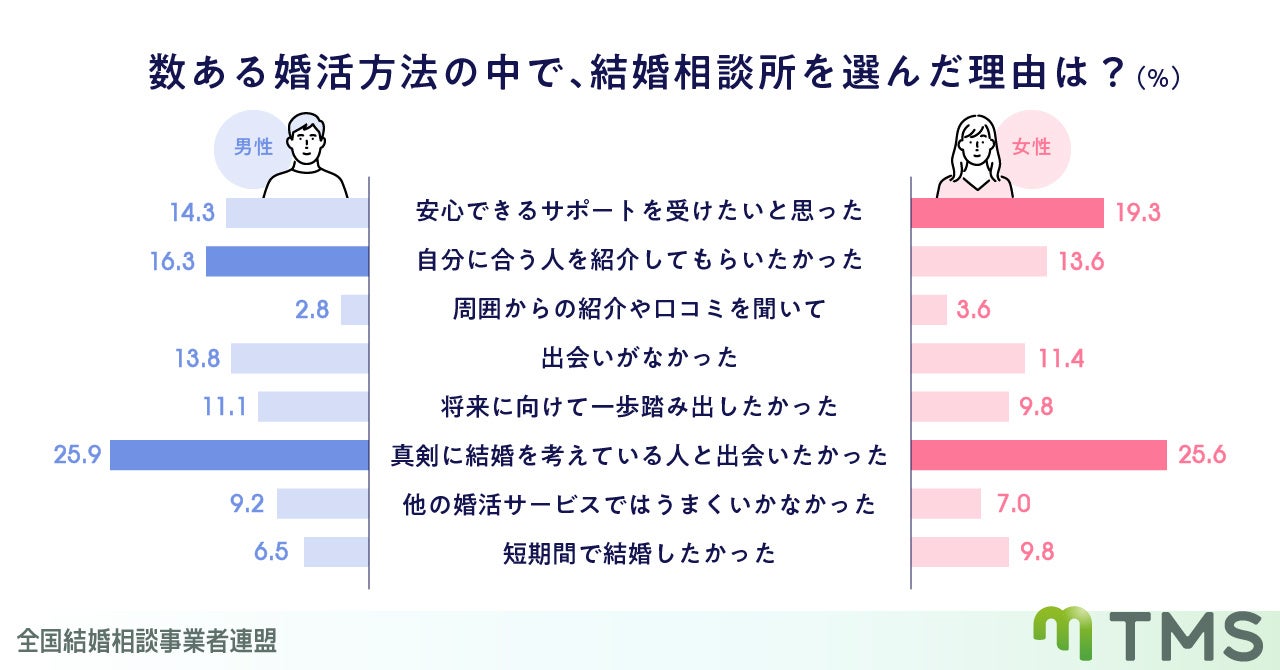 全国の1300店舗以上の結婚相談所が加盟し、成婚率の高いサービスを誇るTMS 全国結婚相談事業者連盟(https://www.nakoudonet.com/)は、現在結婚相談所で活動中の男女を対象に「現在入会している結婚相談所を選んだ決め手」と「数ある婚活方法の中で結婚相談所を選んだ理由」についてのアンケート調査を実施いたしました。その結果、結婚相談所入会の決め手として最も多かったのは「仲人の人柄やサポート内容」であり、男女ともに約3割がこの要素を最も重視していたことが明らかとなりました。
