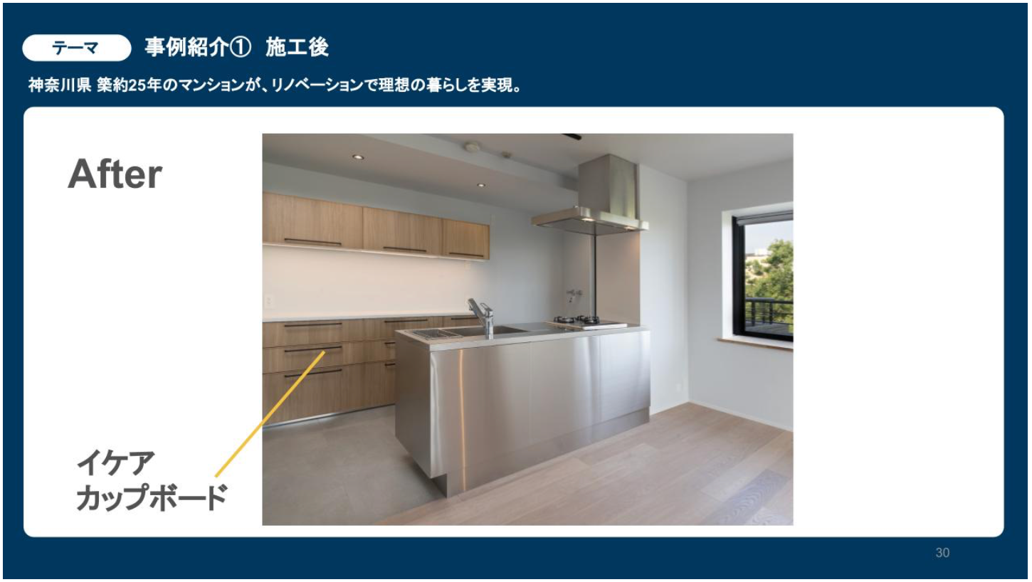 実際にリノベ不動産でリノベーションを検討する方々の中には、イケア家具を活用したいと相談してくる方もいらっしゃいます。本セミナーでは、そんなイケア家具を取り入れた事例を複数ご紹介させていただきました。