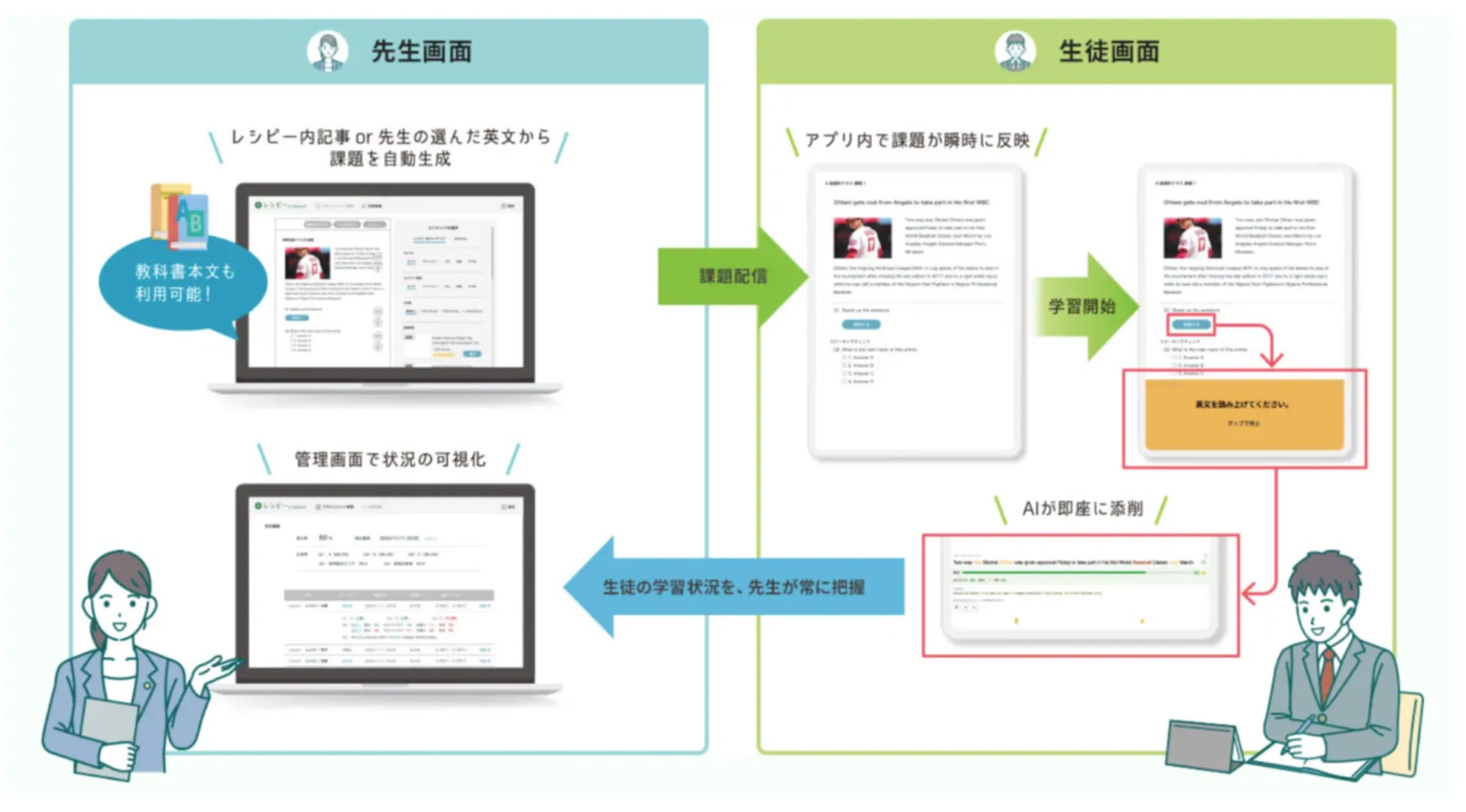 『レシピー for School』内の記事や動画コンテンツ、あるいは教科書や先生の選んだ記事を入力するだけで、授業や宿題に活用できる単語や内容理解の問題、ライティング・ディスカッションのトピックなどをAIが自動で生成します。この機能により、問題作成や採点、さらに生徒ごとの学習の進捗状況といった先生の負担が大幅に軽減されます。