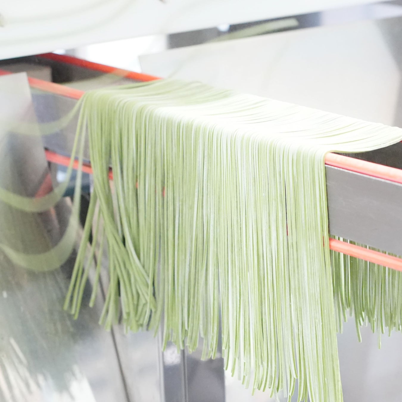 切り出された麺は、翠のカーテンのように並べられた状態で、約42時間をかけて低温乾燥。水分量14.4%以下まで丁寧に仕上げることで、抹茶の香りと色味を損なうことなく、強いコシと上品な風味を保ちます。この時間と手間の積み重ねこそが、祇園辻利の抹茶と、老舗製麺所の技を融合させた「麺なる抹茶」の所以です。