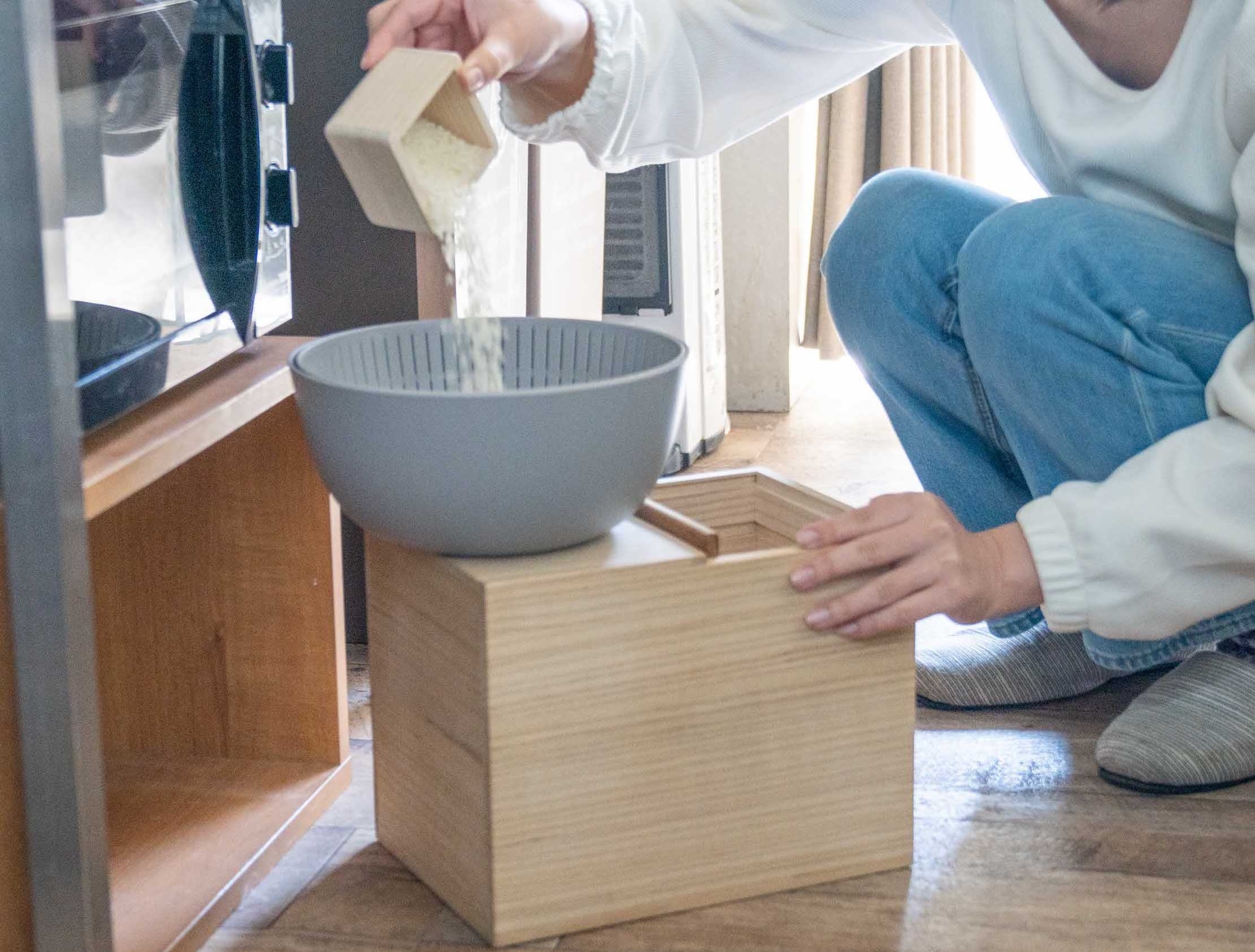 米びつの内面の底の角には角度がつけられており、お米が残り少なくなっても枡でしっかりと掬い取りやすいように工夫されています。