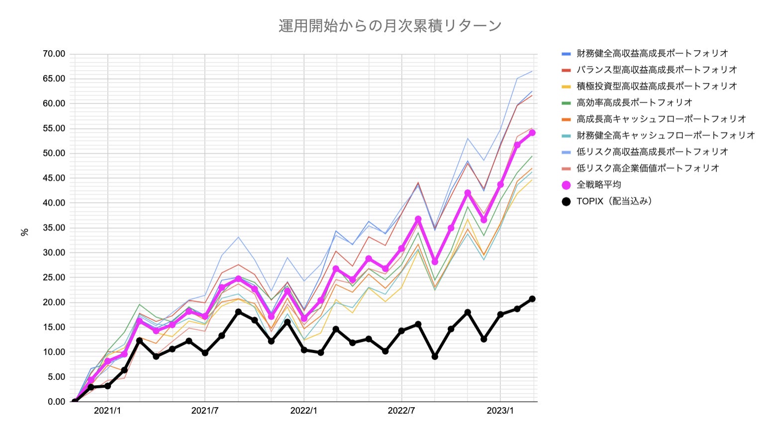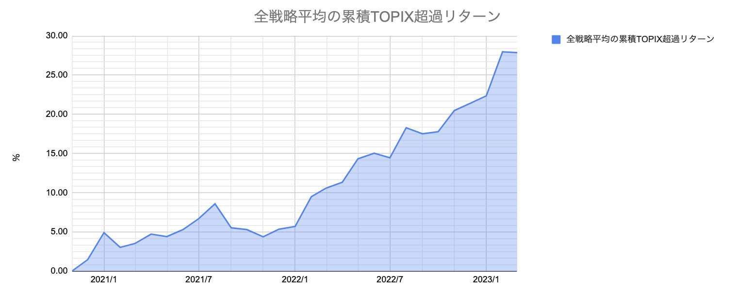 運用開始からの各戦略月次累積リターン、全戦略平均の累積TOPIX超過リターンについては下記グラフをご確認ください。