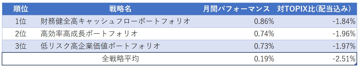 Wealth Wingがご提供する全8戦略の平均運用成績は、月間で+0.19%、対TOPIX比で-2.51%となりました。