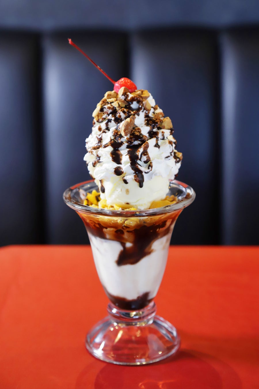 MLB café FUKUOKAのスイーツの中でも人気のホットファジーサンデー。スイートポテトと栗の秋の味覚をふんだんに取り入れた白玉ぜんざいです。