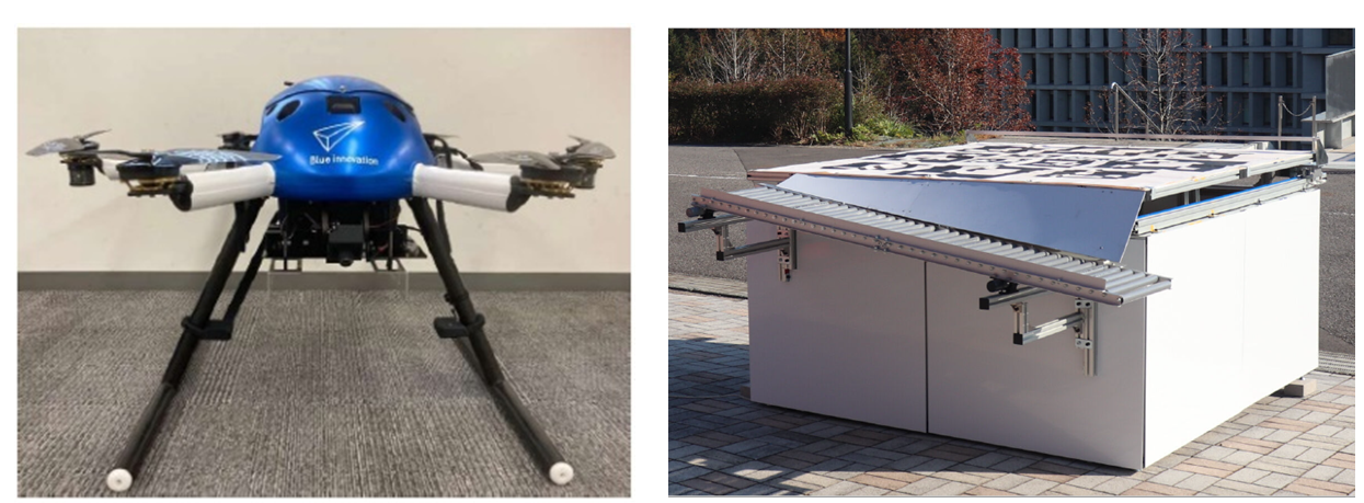 <実験に使用するドローン「PF2」(株)ACSL社製(左)、ドローンポート ブルーイノベーション(株)社製(右)>