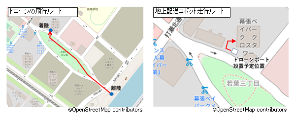 本実証実験では、幕張ベイパーククロスタワー&レジデンス(マンション内外)および若葉3丁目公園にて、ドローンをマンション付近まで飛行させ、積載した荷物をドローンポートを介して地上配送ロボットへ受け渡し、エレベーターを経てマンション個宅の玄関前まで配送する実験を行います。