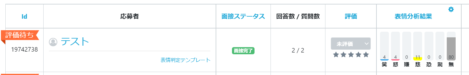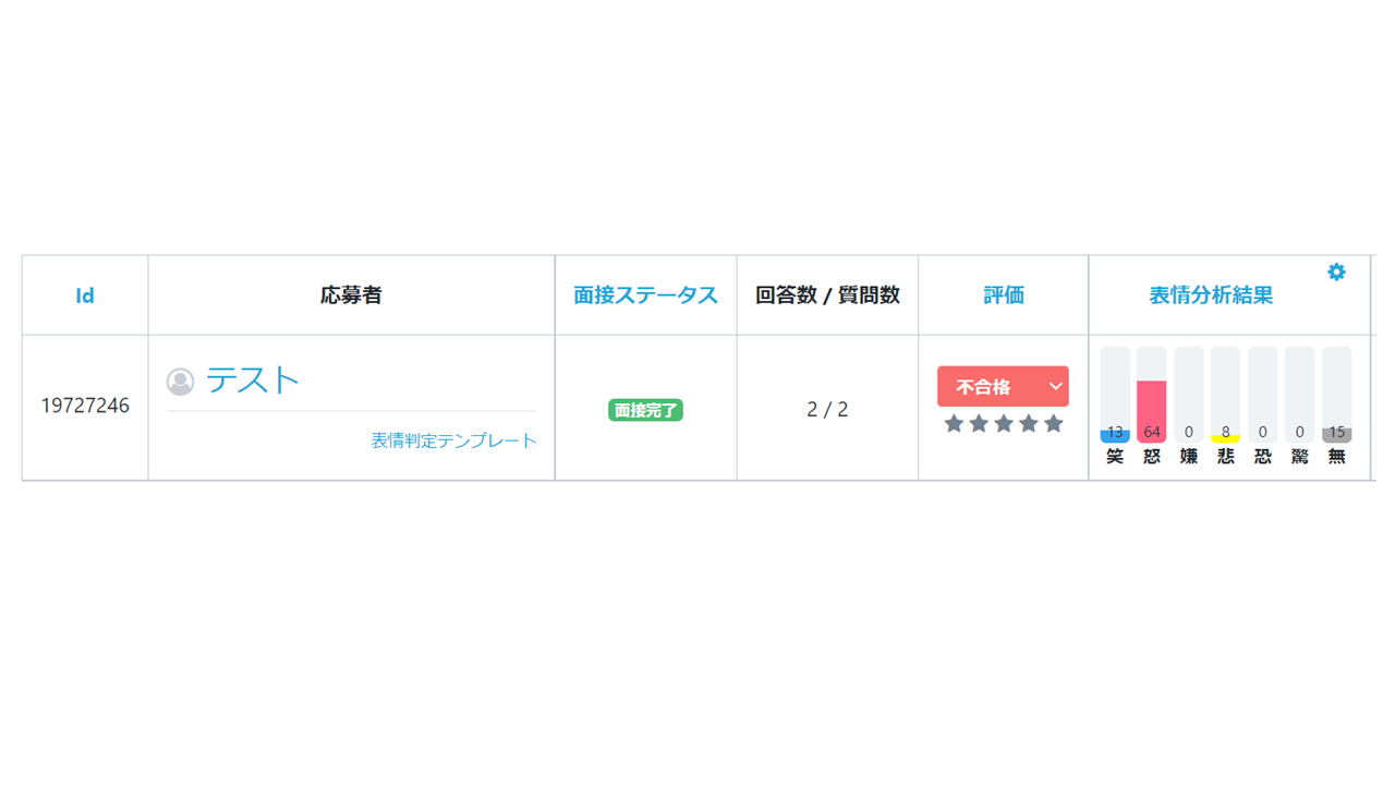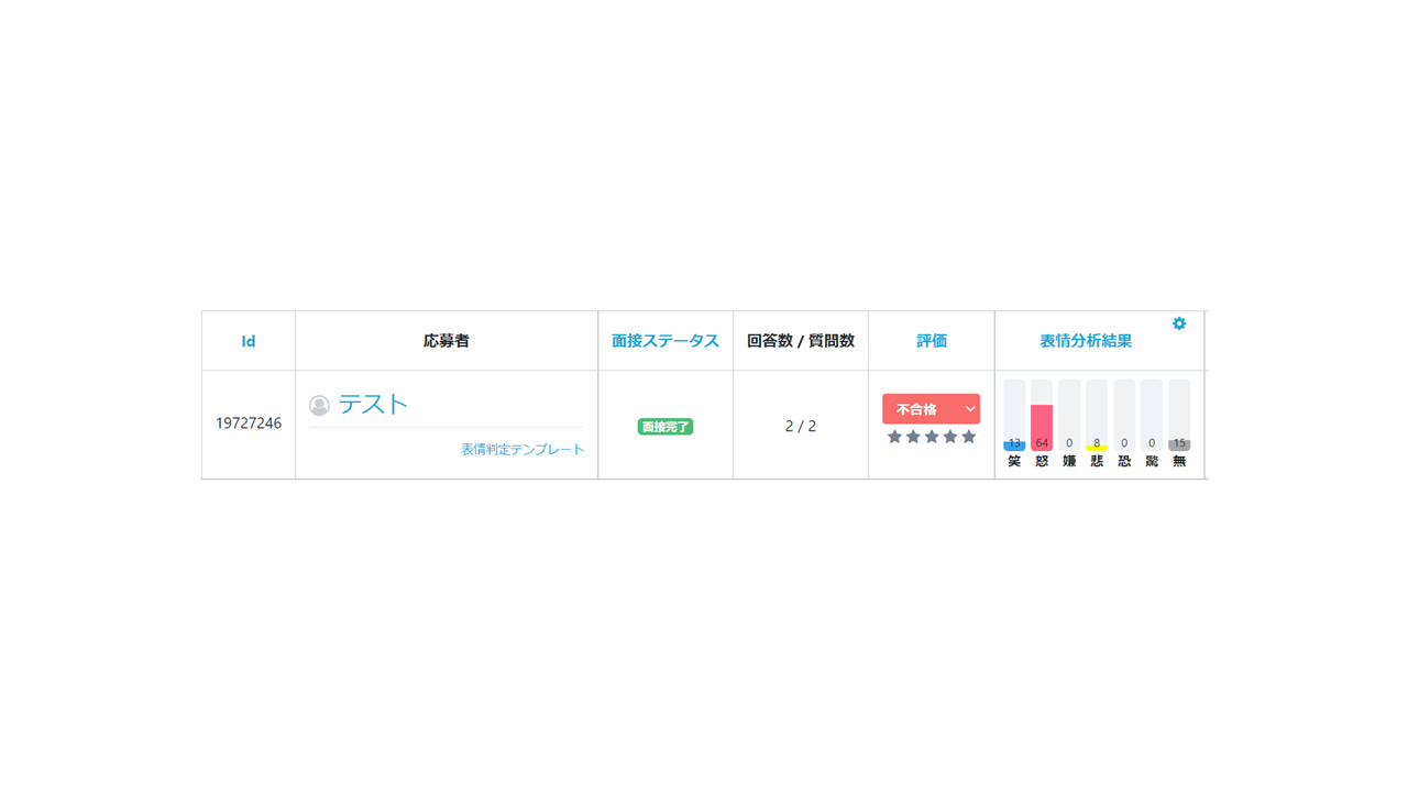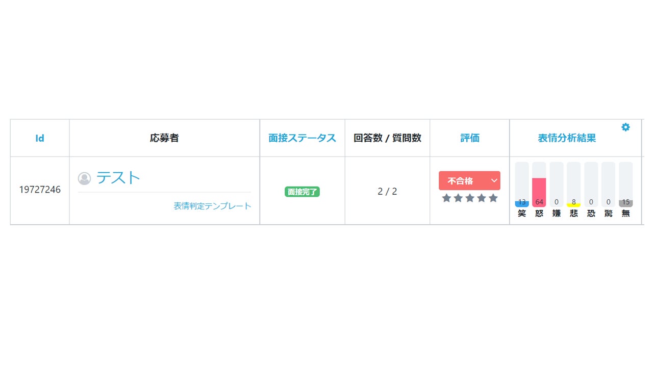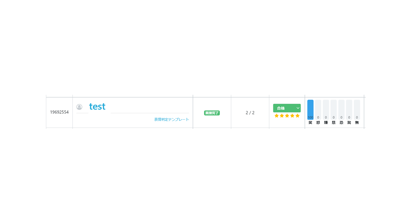 AI(人工知能)で応募者の表情から感情を分析し判定結果を数値化し一覧画面から表情判定結果が確認可能。効率的に優先度の高い応募者から選考を進められて欲しい人材を逃しません。