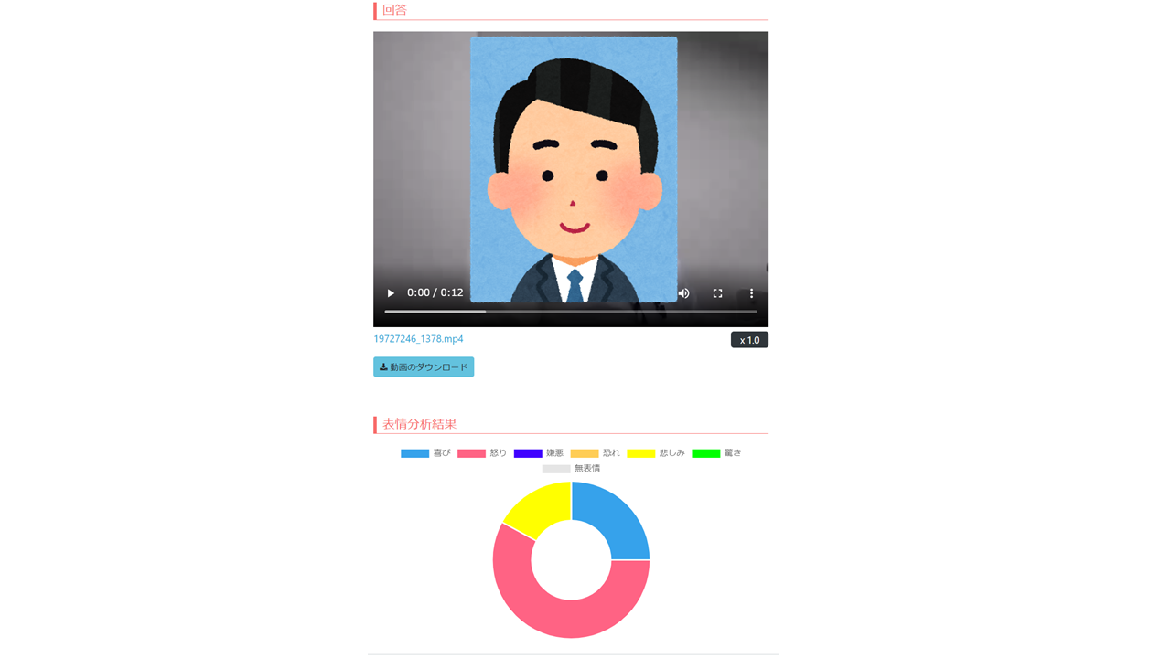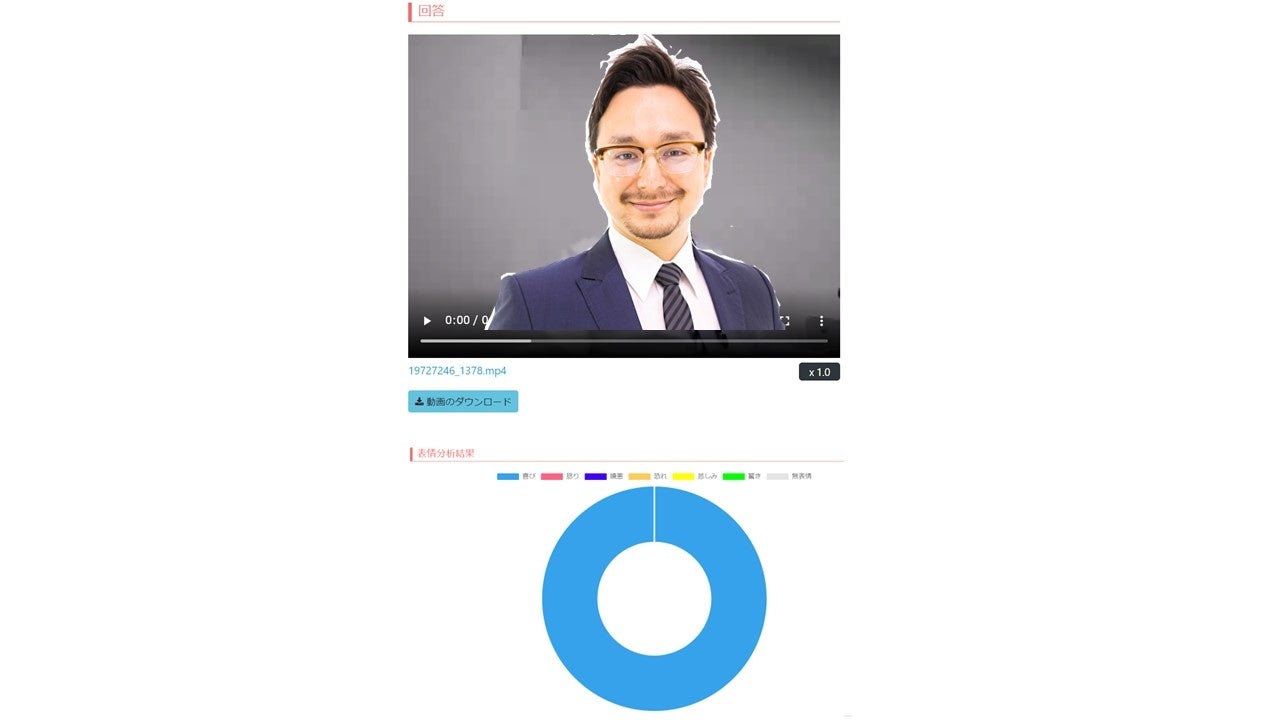 ITSUMENではカメラで表情を読み取りその映像をAIが分析し判定結果を数値化しております。一覧画面では棒グラフ表示、応募者詳細画面では円グラフで視覚的に判定結果を確認出来るようになっています。その為、書類選考やエントリーシートだけでは分かりにくい、人となりも判定結果を参考に録画選考を進められます。AI分析を選考に取り入れることで面接官の好みや第一印象など主観的な要素を排除し公平な評価を行えるようになります。また応募者も面接官との相性に選考結果が左右されにくくなり不公平感の解消にも繋がります。