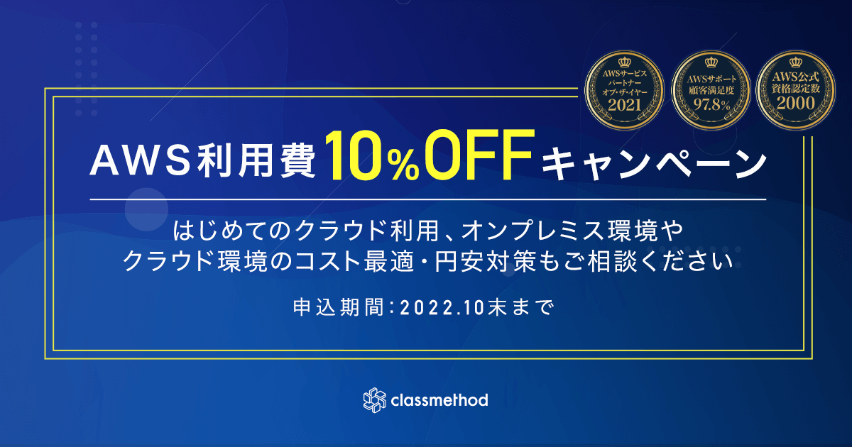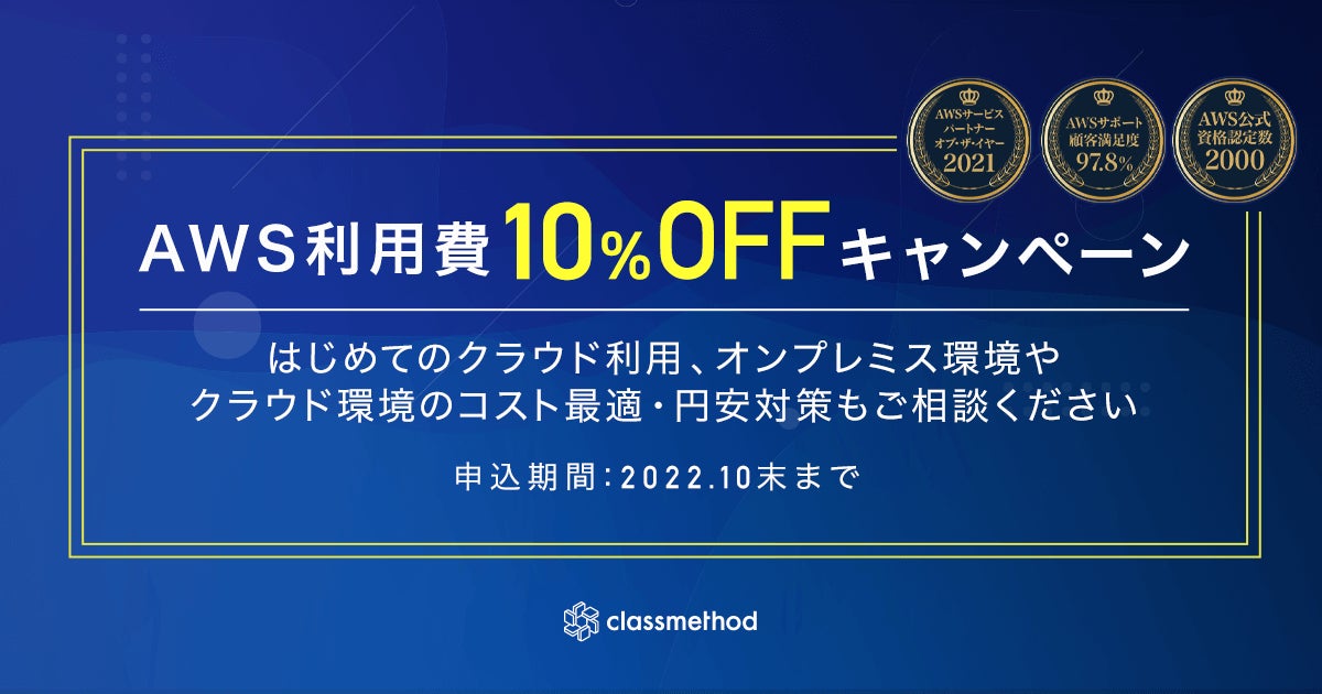 クラスメソッド株式会社(本社:東京都千代田区、代表取締役社長:横田 聡、以下「クラスメソッド」)は、お客様企業のオンプレミス環境からのスムーズなクラウド導入を支援するため、2022年7月7日(木)よりアマゾン ウェブ サービス(AWS)の新規発行アカウントに対して、利用費を期間限定で一律10%割引とするキャンペーンを開始します。