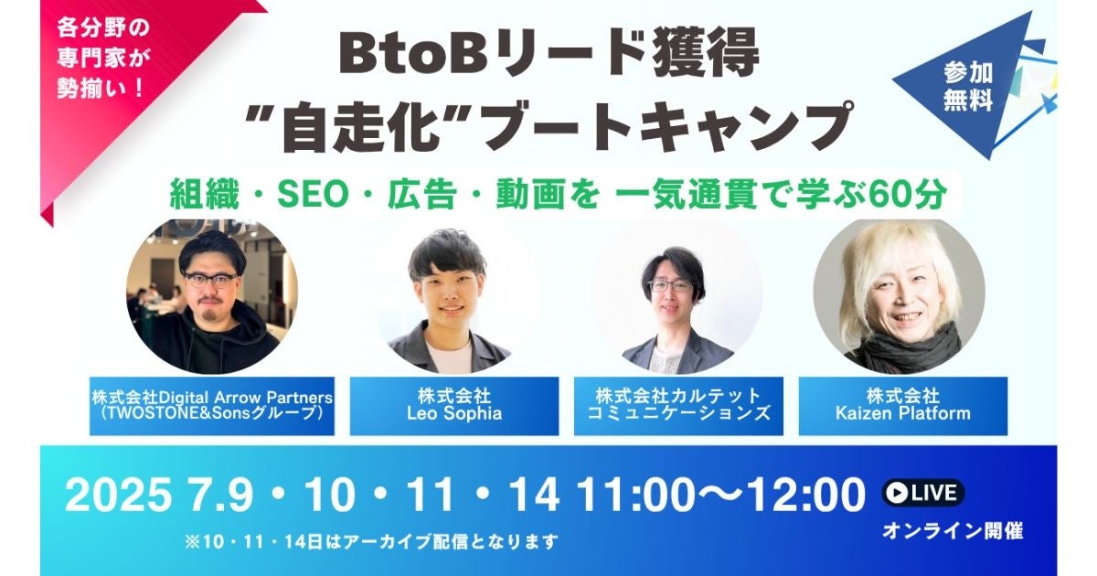 株式会社TWOSTONE&Sonsの100%子会社である株式会社Digital Arrow Partners(所在地:東京都渋谷区、代表取締役CEO:道家康貴、以下 Digital Arrow Partners)は、2025年7月9日(水)に株式会社LeoSophia(本社:東京都目黒区、代表者:永崎太一、以下 LeoSophia)、株式会社カルテットコミュニケーションズ(本社:愛知県名古屋市、代表取締役:堤大輔、以下 カルテットコミュニケーションズ)、株式会社Kaizen Platform(本社:東京都港区、代表取締役:須藤憲司、以下 Kaizen Platform)と4社共催でセミナーを開催することをお知らせいたします。