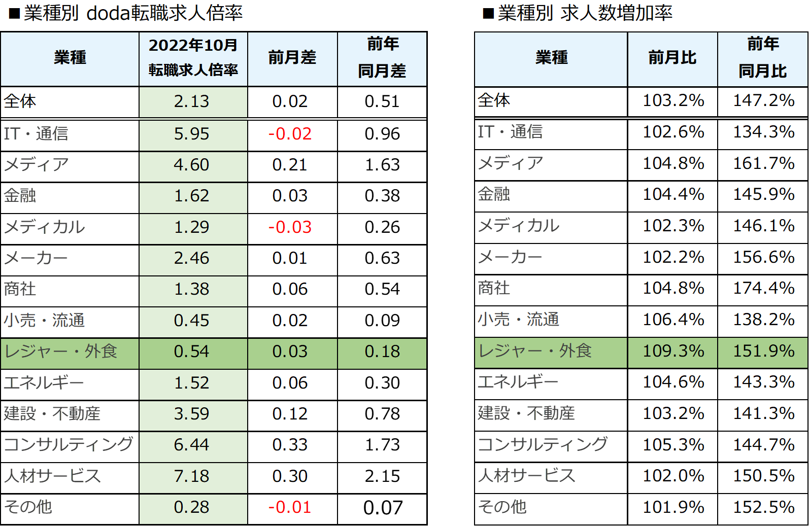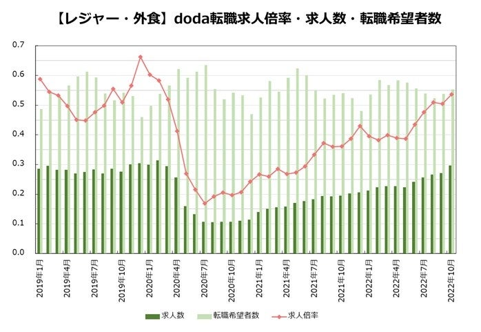 【レジャー・外食業界】doda転職求人倍率2022年10月は0.54倍(前月差+0.03ポイント)