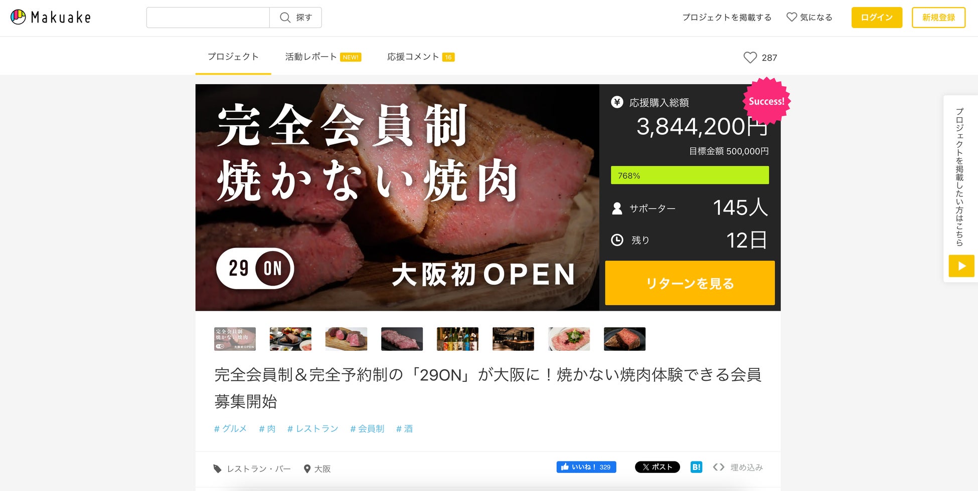 2024年10月9日よりスタートしたMakuakeプロジェクトでは、多くの応援をいただき、10月11日現在目標の7倍の達成率となっており、Makuake内のプロジェクト総合ランキングで1位を獲得するなど、大阪の飲食ファンの皆様から大きな注目をいただいております。