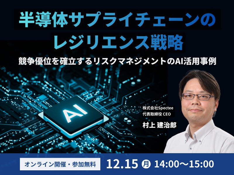 レジリエンス領域でDXを推進する株式会社Spectee(本社:東京都千代田区、代表取締役:村上 建治郎、以下 Spectee)は 、2025年12月15日(月)に、半導体業界の経営層、調達・購買、SCM、リスク管理部門の方々を対象とした無料オンラインセミナー「半導体サプライチェーンのレジリエンス戦略 ~ 競争優位を確立するリスクマネジメントのAI活用事例」を開催いたします。