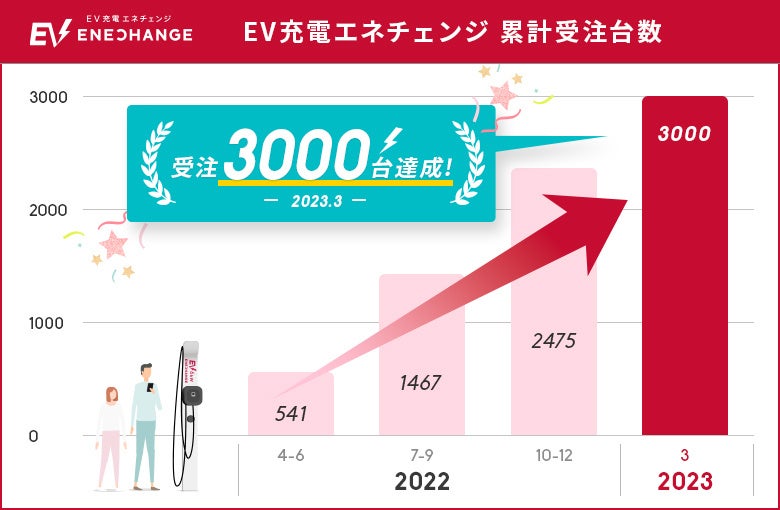 ENECHANGE(エネチェンジ)株式会社(本社:東京都中央区 代表取締役CEO:城口洋平、代表取締役COO:有田一平)は、電気自動車(EV)用6kW普通充電器の累計受注台数がこの度3000台を突破いたしましたのでお知らせします。2021年11月のサービス開始から1年4カ月での達成となりました。