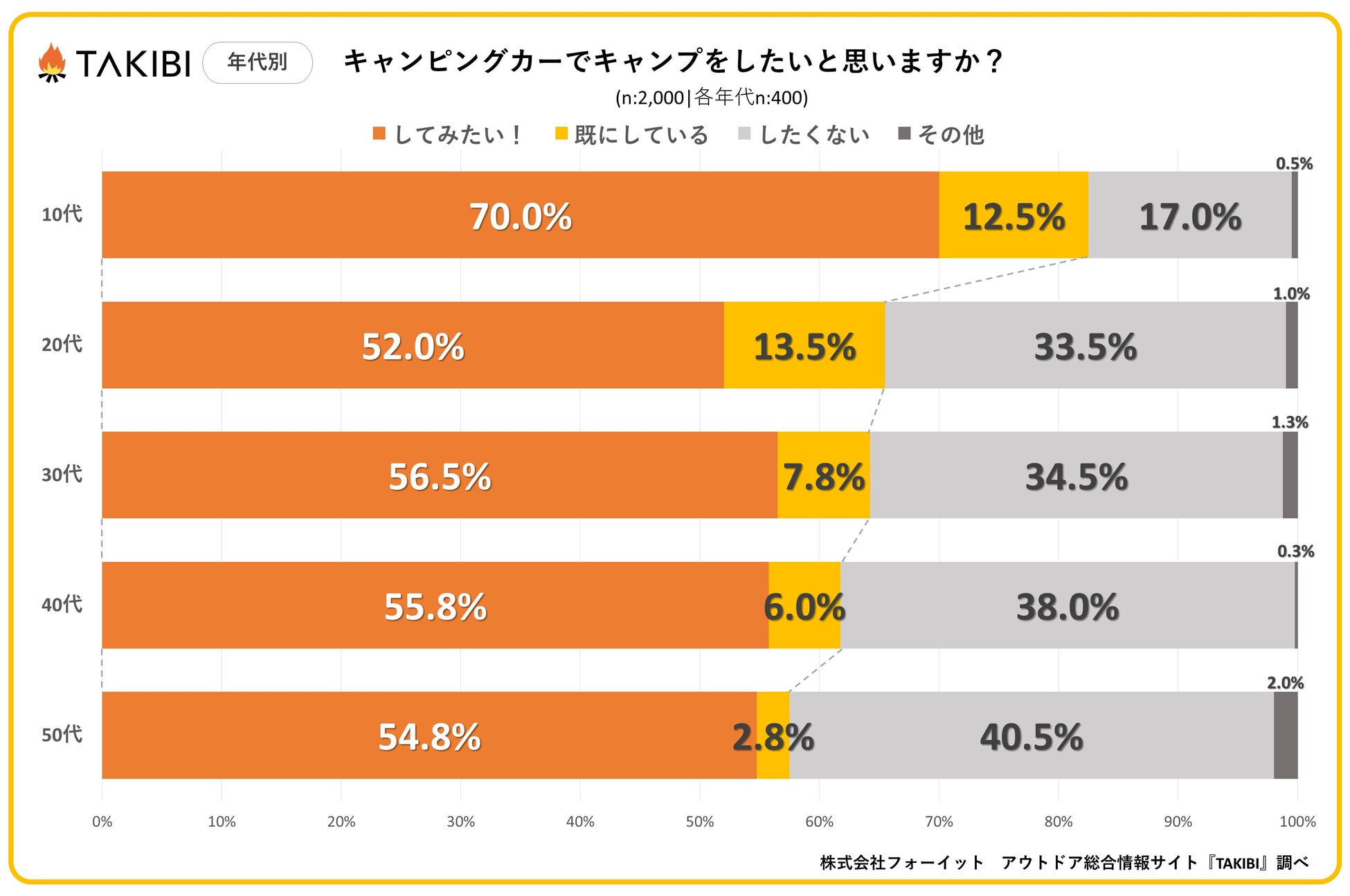 年代別に見ると、キャンピングカーでのキャンプの意欲は10代で最も高く、82.5%が肯定的な意見となりました。