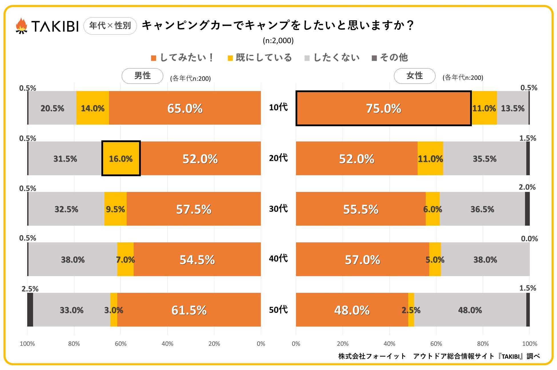 キャンプやグランピングを中心としたアウトドア総合情報サイト「TAKIBI」の運営をおこなう株式会社フォーイットは、全国の10代~50代までの男女2,000人を対象にキャンプに関するアンケートを実施し、男女別・年代別等の特徴についてまとめました。