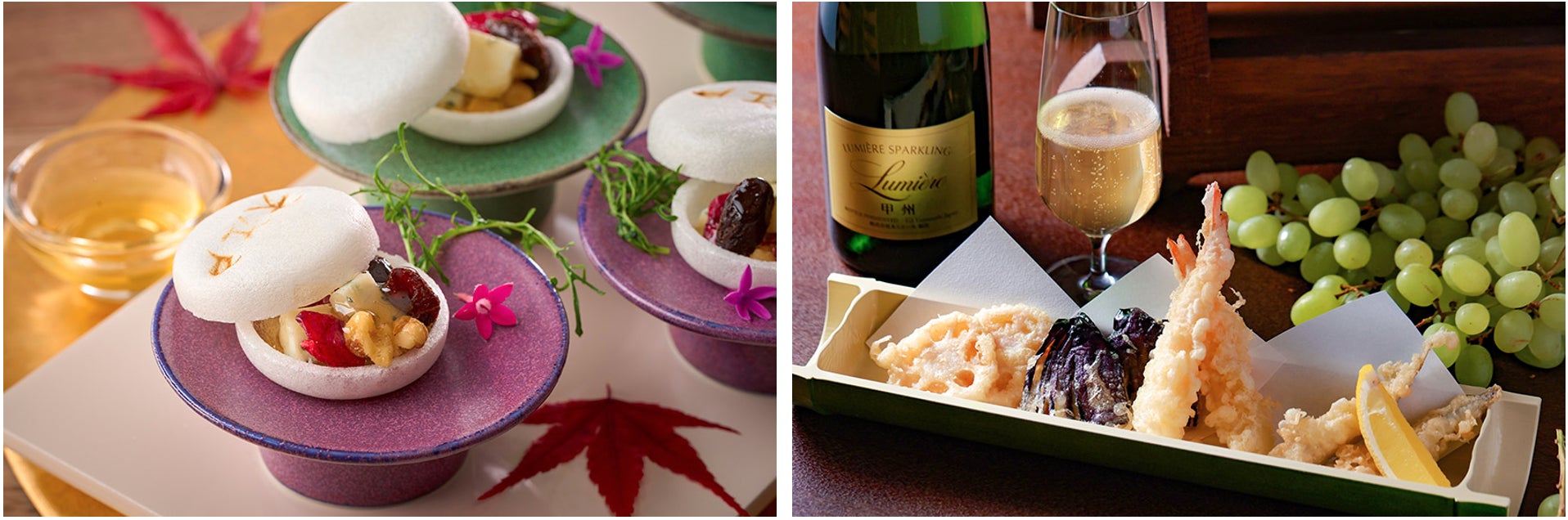 右:ライブキッチンから揚げたてでご提供する天ぷらには、スパークリングワインや白ワインを合わせてお楽しみください。