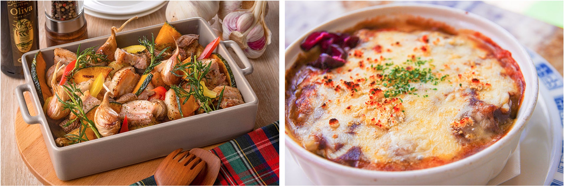 右:【焼きチーズキーマカレー】もライブキッチンからご提供します。ぴりっとスパイシーなカレーにチーズのコクが加わった熱々の美味しさをどうぞ。