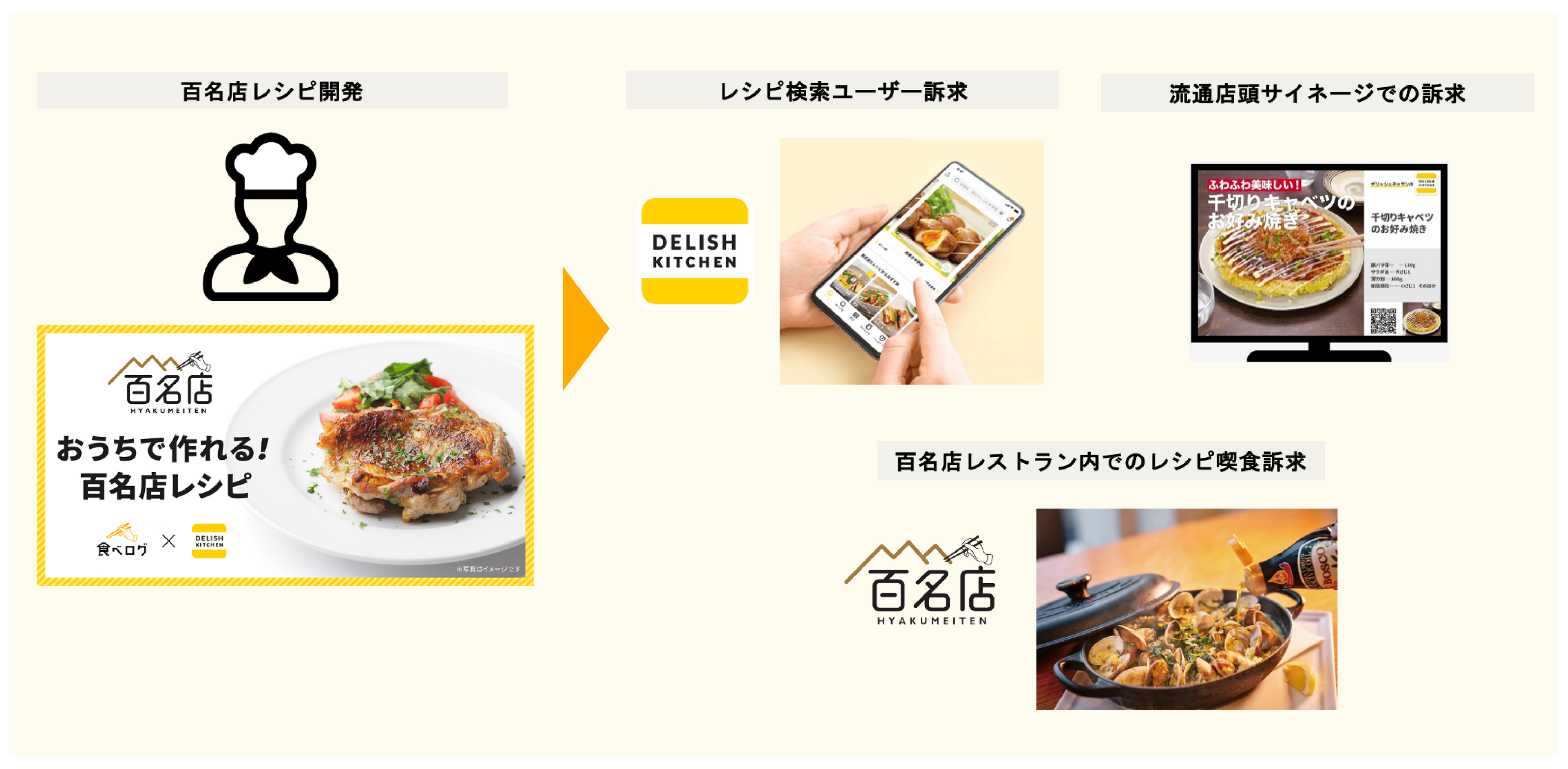 考案されたレシピをもとに、『DELISH KITCHEN』で誰でも再現できるようレシピ動画を制作。同コンテンツをアプリや店頭サイネージで配信し、商品の認知から購買促進を図ることができます。また、「食べログ 百名店」のレストランでは実際に開発したレシピを期間限定で提供し、喫食体験を創出することができます。