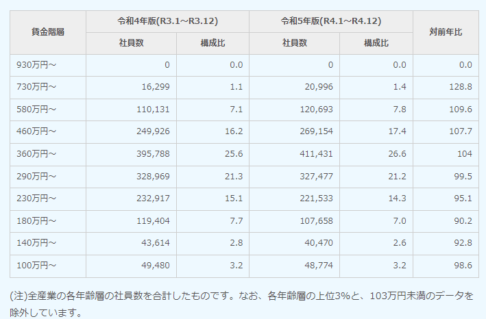 年間支給総額の分布(全産業・全年齢)は、下表のとおりでした。賃金階層別の対前年比をみると、より高い賃金階層で上昇していることがわかります。