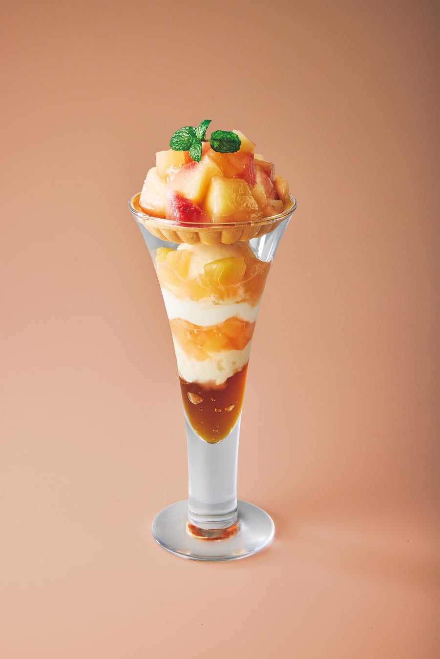 「かわりばんこパフェ 白桃」は、山形県産の白桃の果肉がのったフルーティーな味わいの和パフェです。ほうじ茶の香ばしい風味とレアチーズムースの酸味、濃厚なバニラアイスの甘味が、白桃の味わいを引き立てています。